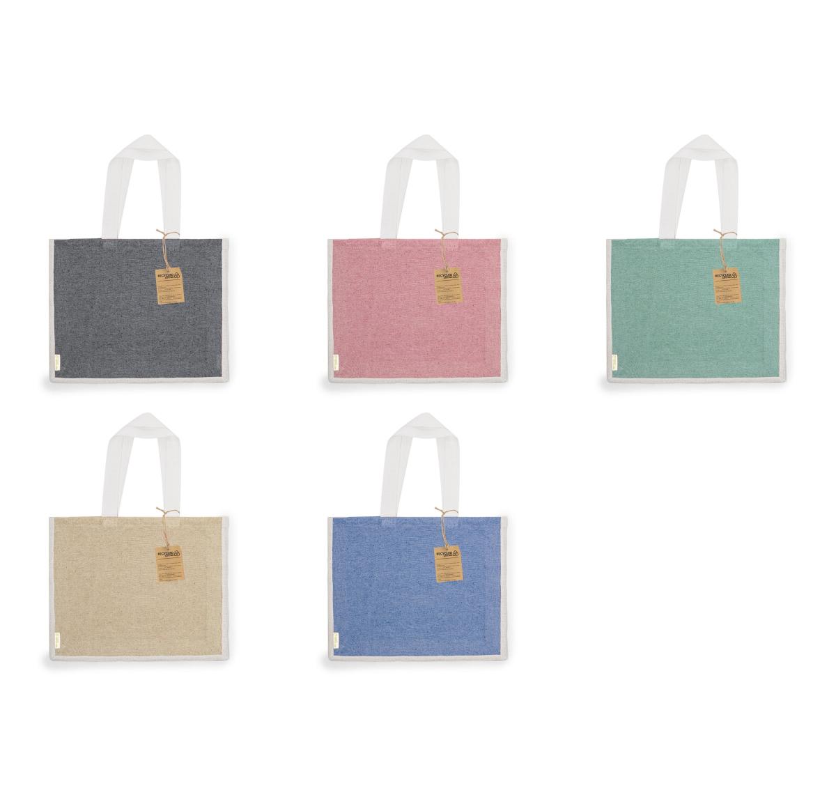 Bag in 100% recycled cotton material 140 g/m2 in combination with jute. Long handles of 70cm with reinforcement, stitched finish and jute gusset. Side label and resistance up to 8 kg in weight. Available in a wide range of eco colours, combined with a natural base.