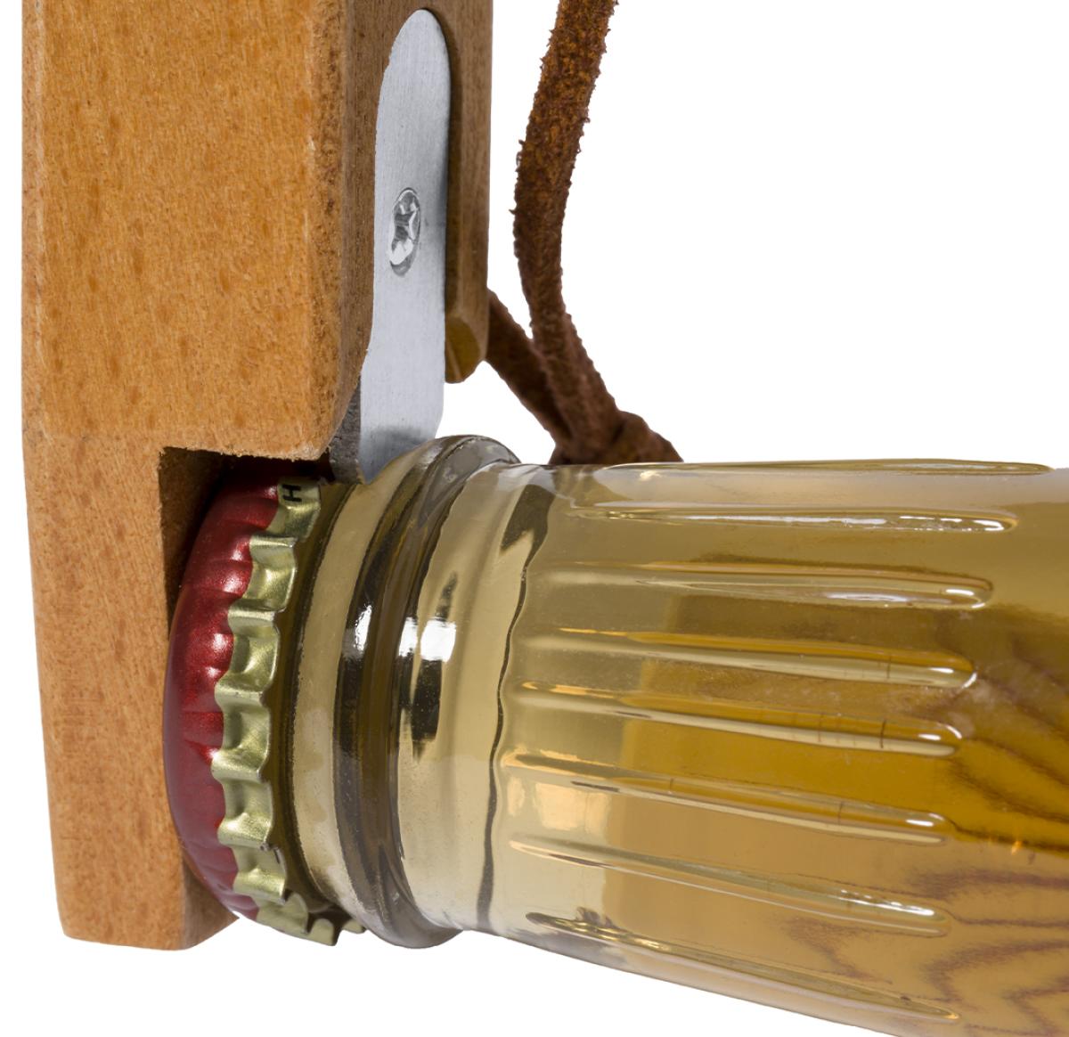 Genuine wooden bottle opener. Eco-friendly design made of soft natural wood with metal tab for a firm hold of the bottle cap, with practical lanyard for a comfortable attachment. Presented in a kraft design box.
