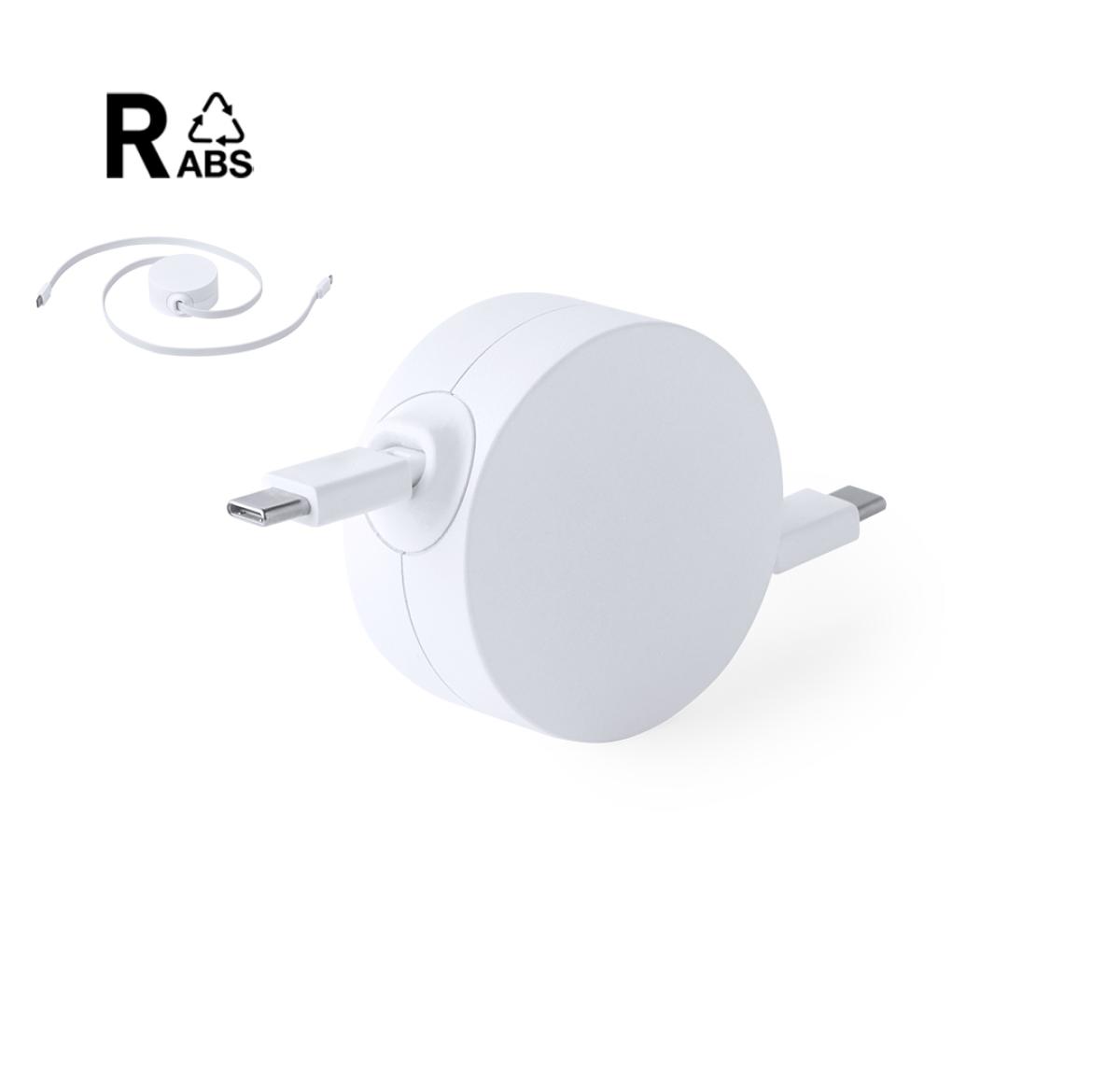 Extendable charger and synchroniser cable, suitable for charging devices and transferring data. Made of resistant white RABS. Central part with large branding area and extendable inner mechanism. Including Type C input and output connections. Presented in an individual bag in kraft design. RABS is a highly recyclable and highly resistant plastic with a multitude of applications that make of it an eco-friendly solution. With RCS certification, guaranteeing its recycled origin. Suitable for data transfer. Extendable Cable. Micro USB, Type C Connection PD 65W