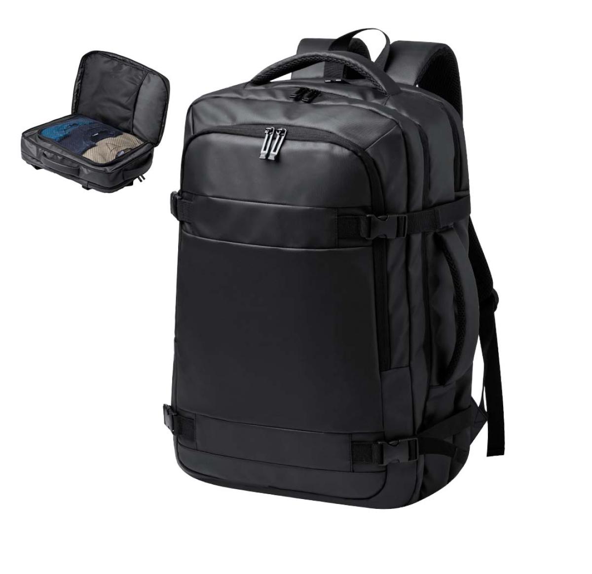 Document backpack crafted in stylish PU leather. Featuring an urban design with a padded laptop pocket for laptops up to 17 inches. Reinforced with side straps, it has a security buckle closure and compartments with double pull zip closure. Its shoulder and back straps are padded and adjustable. It also has a trolley strap and a padded handle for added comfort when used as a document holder. Presented in an individual Recycled bag. Padded. Padded Laptop Compartment