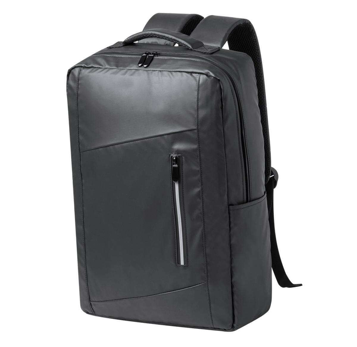 Backpack crafted in stylish PU leather. Characterised by an urban design featuring a padded pocket for tablets up to 10 inches and laptops up to 15 inches. It also features a front pocket enhanced by a reflective band. Back and shoulder straps are padded, adjustable and made of breathable fabric on the inside. Trolley fitting and a comfortable padded top handle included. Presented in an individual Recycled bag. Padded Laptop and Tablet Compartment. Padded Back and Shoulder Straps