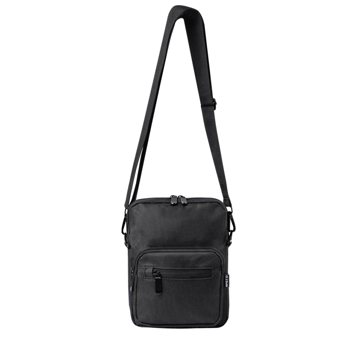 Shoulder bag made of RPET 600D polyester, with a central zipped pocket and double puller, and two front compartments with quick access and zipped closure. Equipped with an adjustable strap for comfort and a RPET label. Presented individually in a recycled bag.