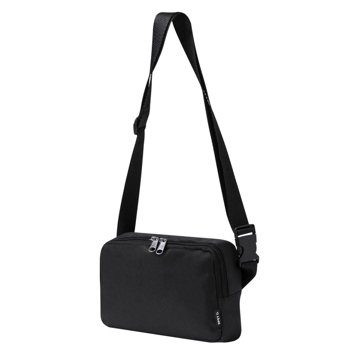 Rectangular design waist bag made of RPET 600D polyester. Features a central zipped pocket with double puller and adjustable strap with buckle closure. It also includes a distinctive RPET label and comes individually packaged in a recycled bag. RPET material is made from recycled plastic, thus promoting the reuse of plastic waste and helping the sustainability of the planet.