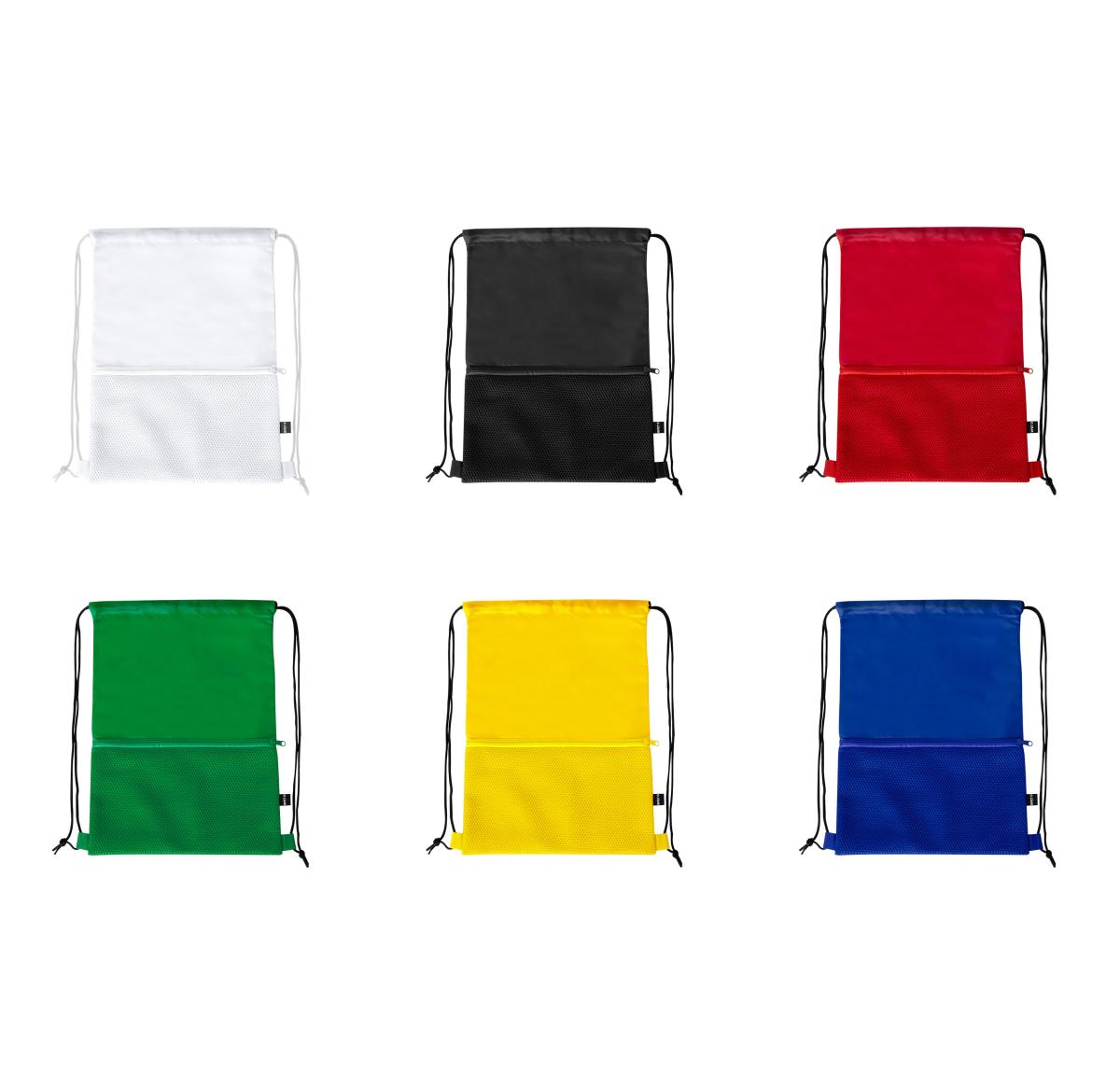 Drawstring backpack made of soft 210D RPET polyester. Self-closing strings in black color and a front mesh pocket with matching zip closure. RPET side label and available in a variety of colours (white color specially made for sublimation printing).