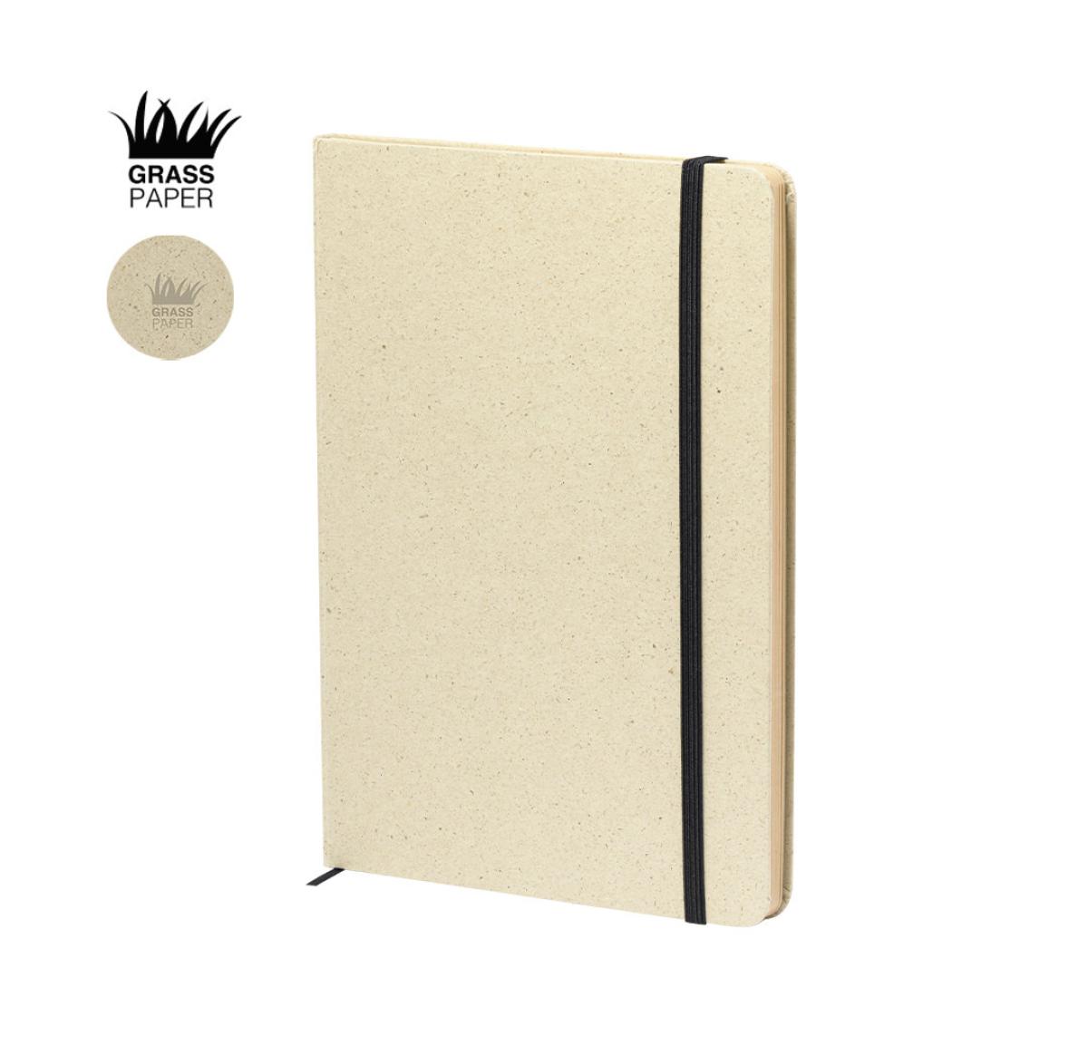 A5 notepad with hard covers made from recycled grass. 80 sheets with single-stripe layout and kraft finish, with bookmark and elastic band in black. Grass Paper logo on front and back coversm and presented in an individual bag. Grass paper is a perfect alternative that guarantees sustainability during the manufacturing process, reducing the environmental impact due to a fast growth and low demand of resources to cultivate it. In addition, 50% grass-based paper is combined with other environmentally friendly elements, such as recycled wood. Hard Cover. 80 Sheets