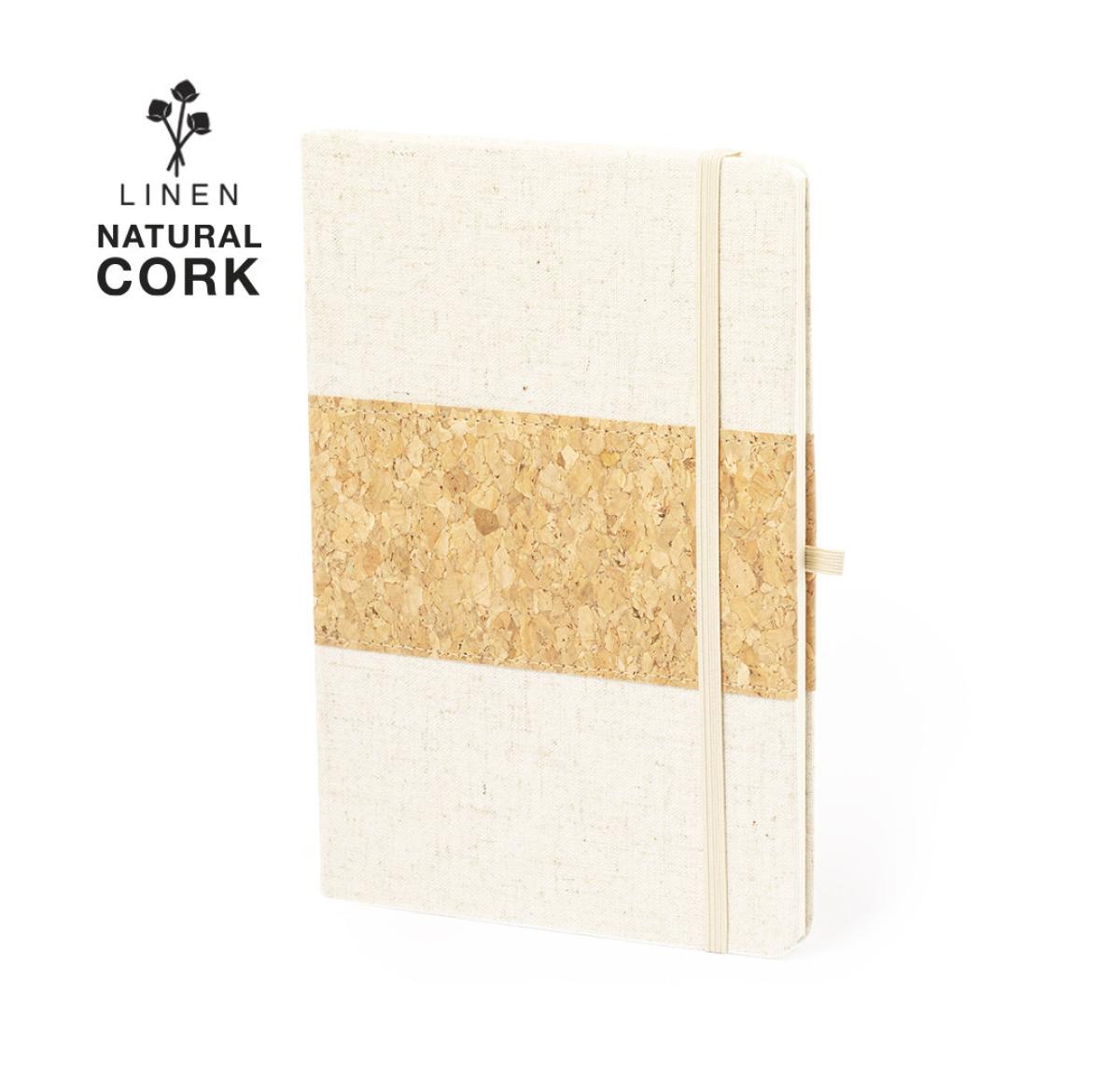 Notepad with hard covers made of cork and linen. With pen holder, bookmark and 80 plain sheets in natural colour. Presented in an individual bag. Made with plant-based elements to promote the use of natural raw materials and reduce polluting emissions. Hard Cover. 80 Sheets