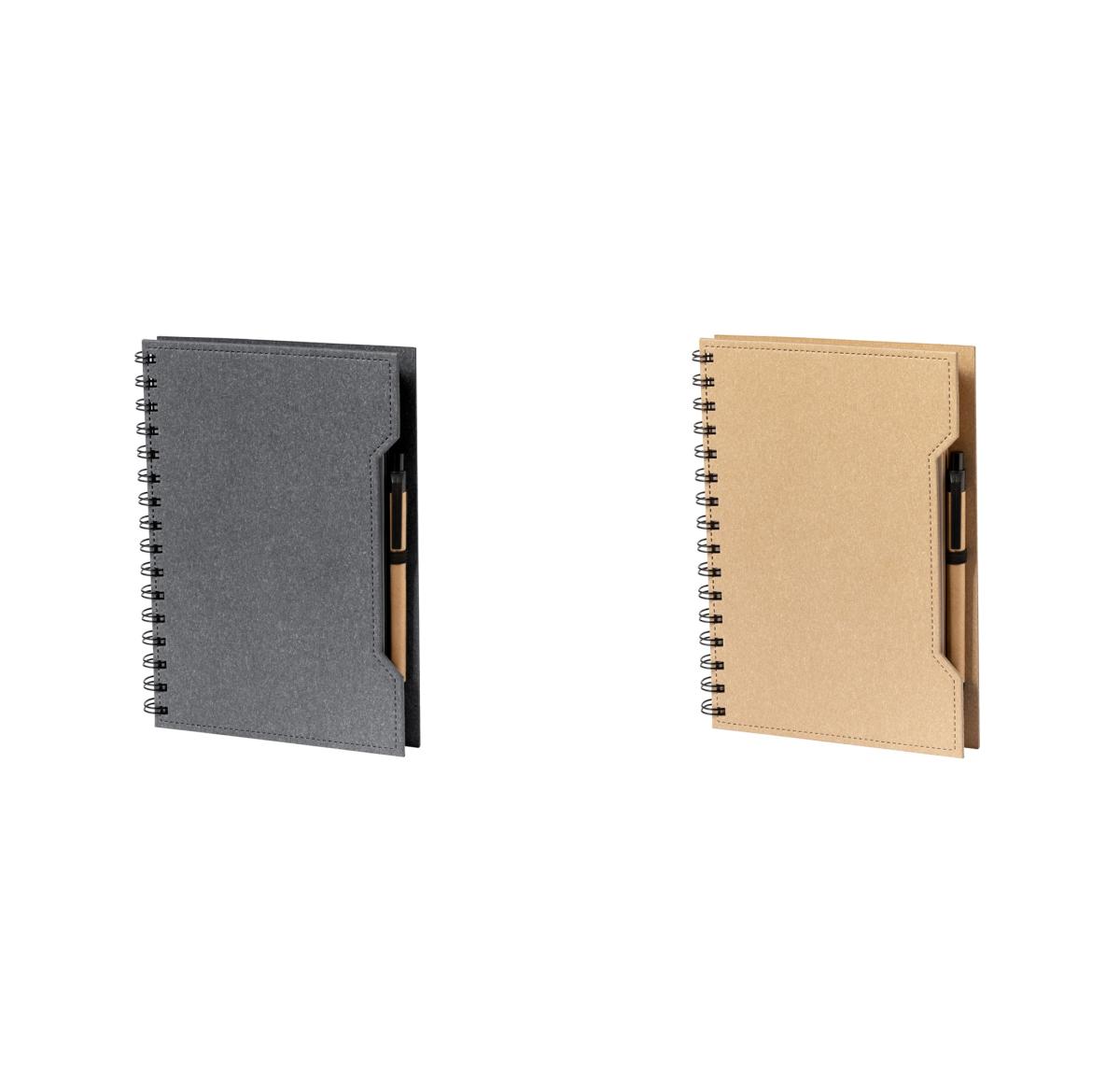 Notebook set made of recycled cardboard. Including a ring notebook with rigid covers made of recycled cardboard and with stitching in contrast colors. 80 plain inner sheets in natural colour, 25 large sticky notes and 100 mini sticky notes in 4 different pastel colours. Including a practical pen holder and a ball pen made of recycled cardboard and in blue ink. Presented in an individual paper bag. Recycled cardboard comes from the reuse of manufacturing surpluses and paper recycling at the end of its lifespan, making it an ecological and sustainable canvas. 80 Sheets Notepad. 25 Sticky Notes 9 x 9 cm. 100 Mini Sticky Notes 2 x 9 cm. Recycled Cardboard Pen Included