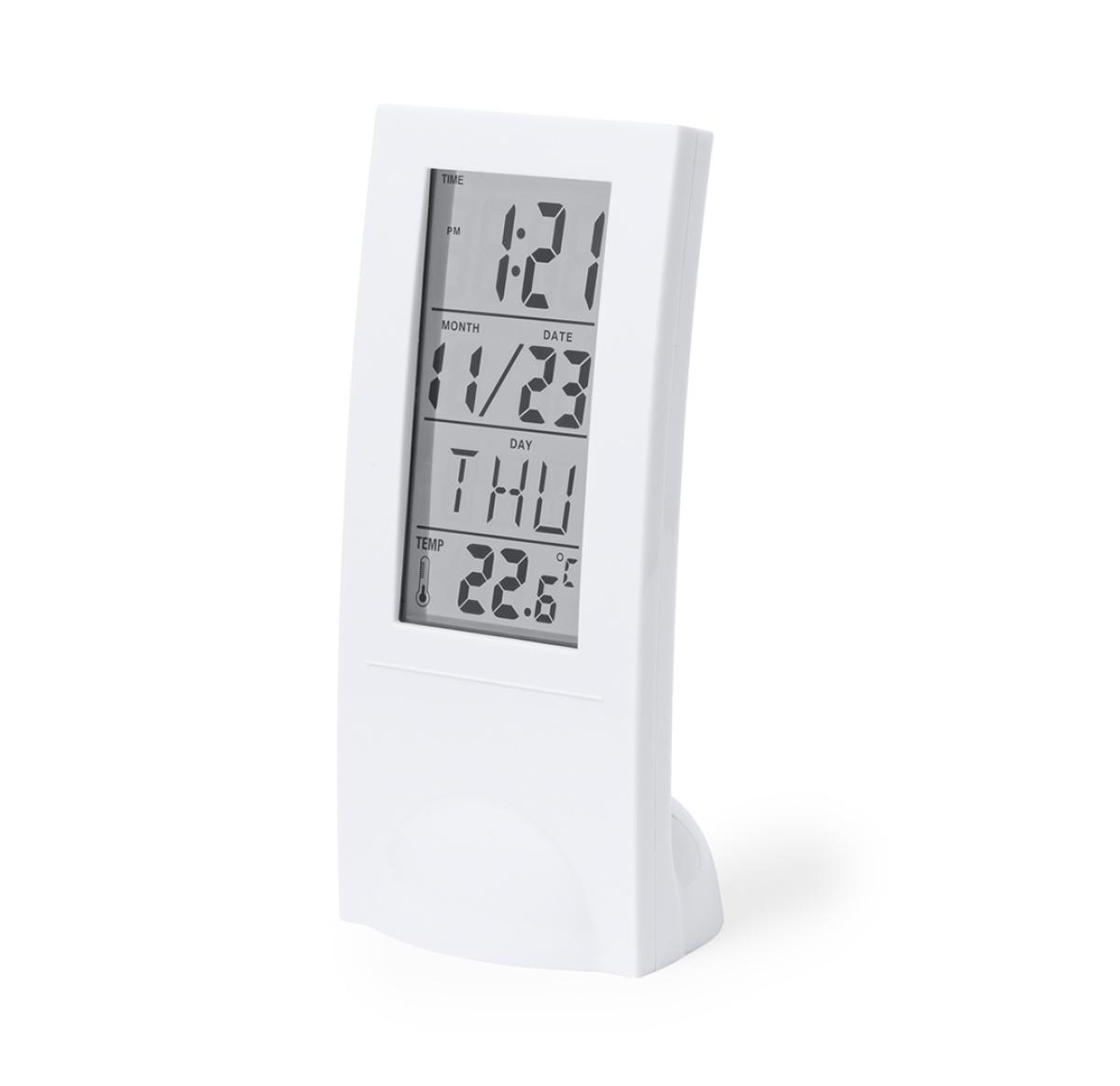 Weather station made of resistant ABS, with temperature sensor. Time function (12/24), calendar, alarm and day of the week. With base/holder and rear control buttons. Battery powered (2xAAA not included) and presented in an attractive kraft design box. Instruction manual available in English and Spanish.