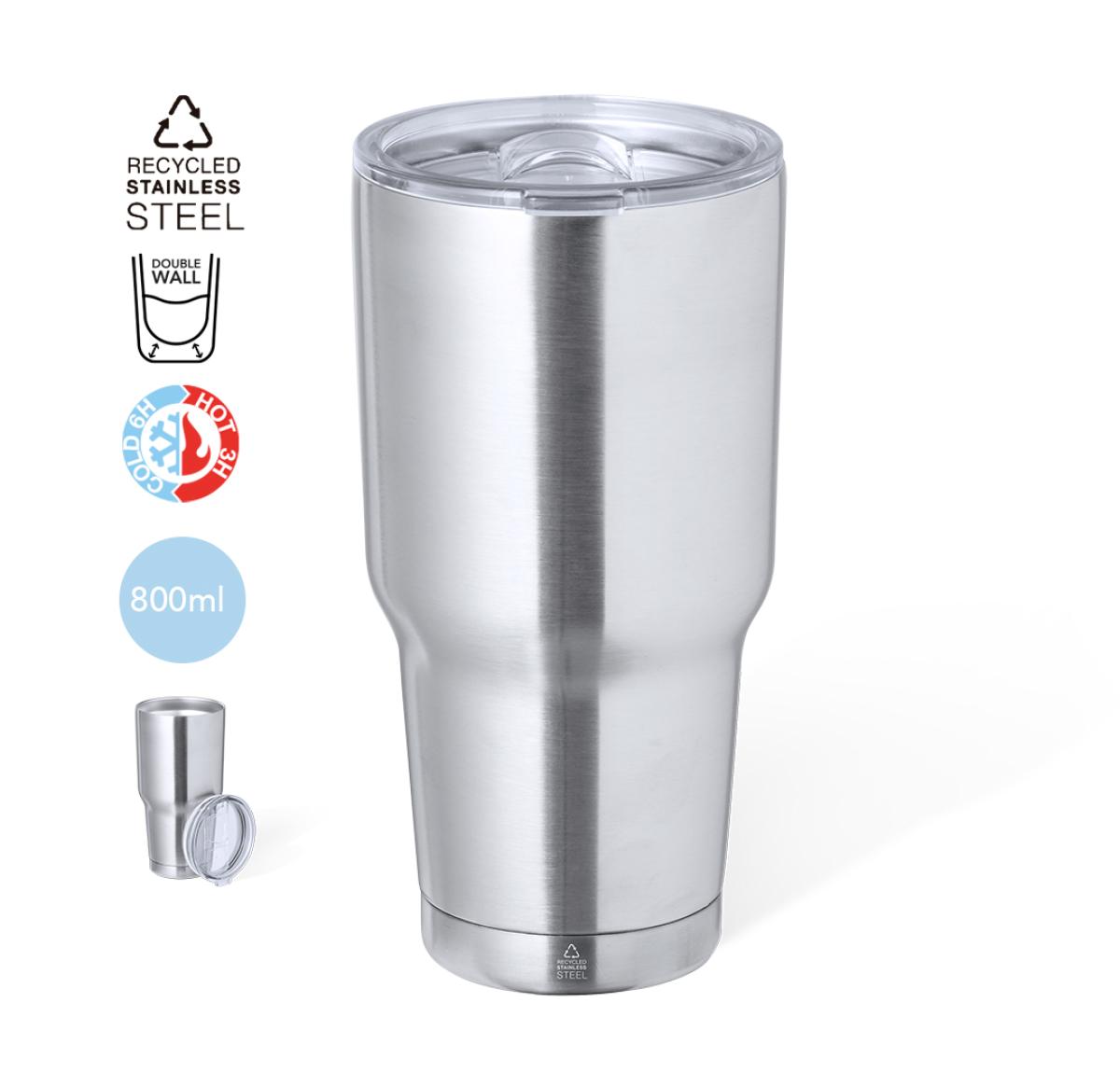 Recycled Stainless Steel thermal tumbler with double wall and 800 ml capacity. With dispenser in lid, BPA free and with silver finish. Recycled Stainless Steel logo and presented in an individual kraft design box. Steel is one of the most demanded materials and can be found almost everywhere, from everyday products to major constructions. With countless properties, including durability and a high level of reusability, it is a much valued alternative for sustainable solutions. Properly treated, new resources of infinite use can be obtained. 800 ml