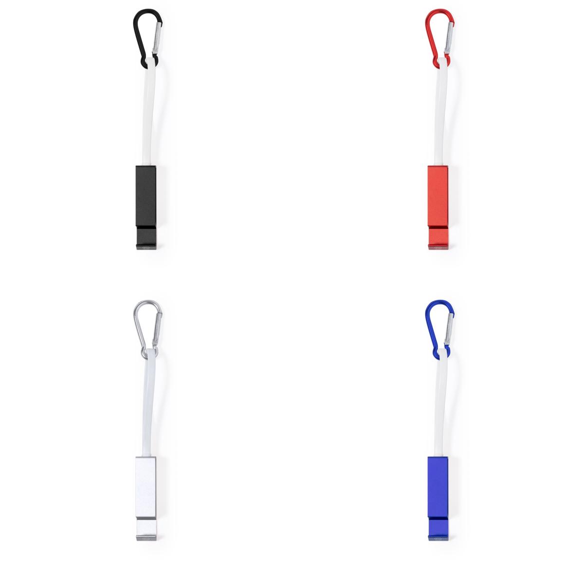 Multi-function charging cable, made of recycled aluminium and with an intelligent design for convenient storage of the charging cables, as well as easy transport. Including matching carabiner and smartphone holder, with Type C connection (input and output) and dual Micro USB / Lightning connection. Available in a variety of metallic finish colours and with Recycled Aluminium logo. Presented in an attractive individual recycled bag. Recycled Aluminium is a material with almost infinite recycling possibilities, keeping its original properties and consuming less energy during this process. GRS Certification (Global Recycled Standard), which guarantees the recycled origin of the material used to manufacture the product. Micro USB, Type C and Lightning Connection 5V DC 2.4A