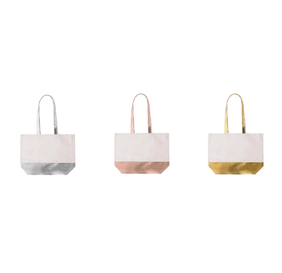 Bag in 100% recycled cotton material 220 g/m2, in combination with metallic PU leather. With gusset and 70cm long handles, available in gold, silver and rose gold, with matching base. Resistance up to 8 kg in weight