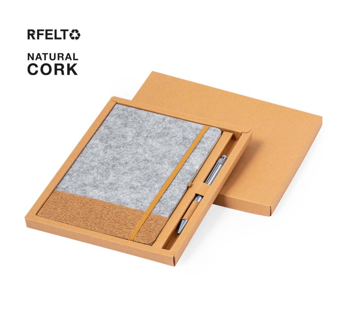 Notepad and ball pen set made of RPET felt and recycled Aluminium. Includes a hard covers notepad, made of RPET felt and natural cork, with 80 plain sheets, elastic band closure, bookmark and a brown ball pen holder. In addition, it includes a recycled Aluminium ball pen with grip made of natural cork, push-button mechanism and blue ink. Presented elegantly in a gift box. RPET felt is the result of the combination of the recycling processes of plastic materials along with the millenary technique of felt manufacturing, resulting in an eco-trend material that, in addition to being of recycled origin, also becomes recyclable. Notepad Hard Cover. 80 Sheets. Pen Recycled Aluminium/ Cork. Jumbo Refill