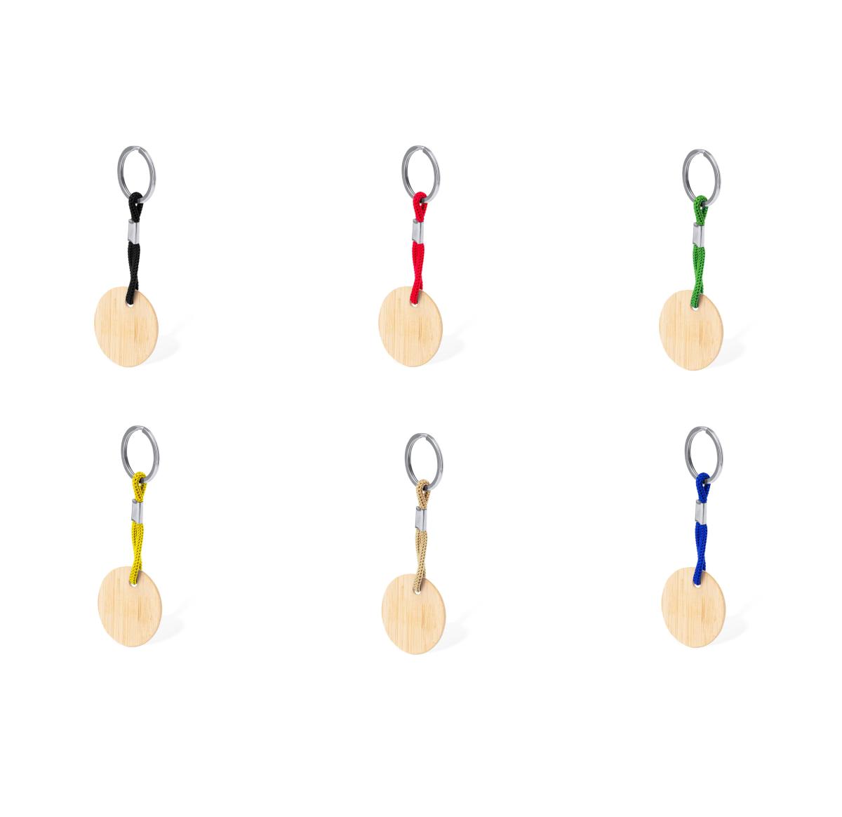 Handy round key ring, made of bamboo, with cord in assorted colours. Ideal for laser engraving. Materials such as bamboo encourage the use of natural raw materials, reducing pollutant emissions. In addition, bamboo comes from a highly resistant and versatile plant, with rapid growth and regeneration, making of it an excellent alternative to traditional wood.