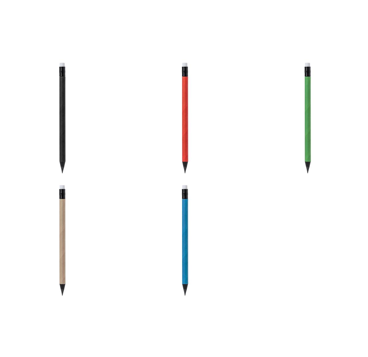 Eternal pencil made of recycled cardboard. Reusable and with infinite writing, to always use the same pencil and not generate waste. Includes eraser on the top of the pencil, with recycled cardboard logo on one end of the barrel. Available in a wide range of colours. Recycled cardboard comes from the reuse of manufacturing surpluses and paper recycling at the end of its lifespan, making it an ecological and sustainable canvas.