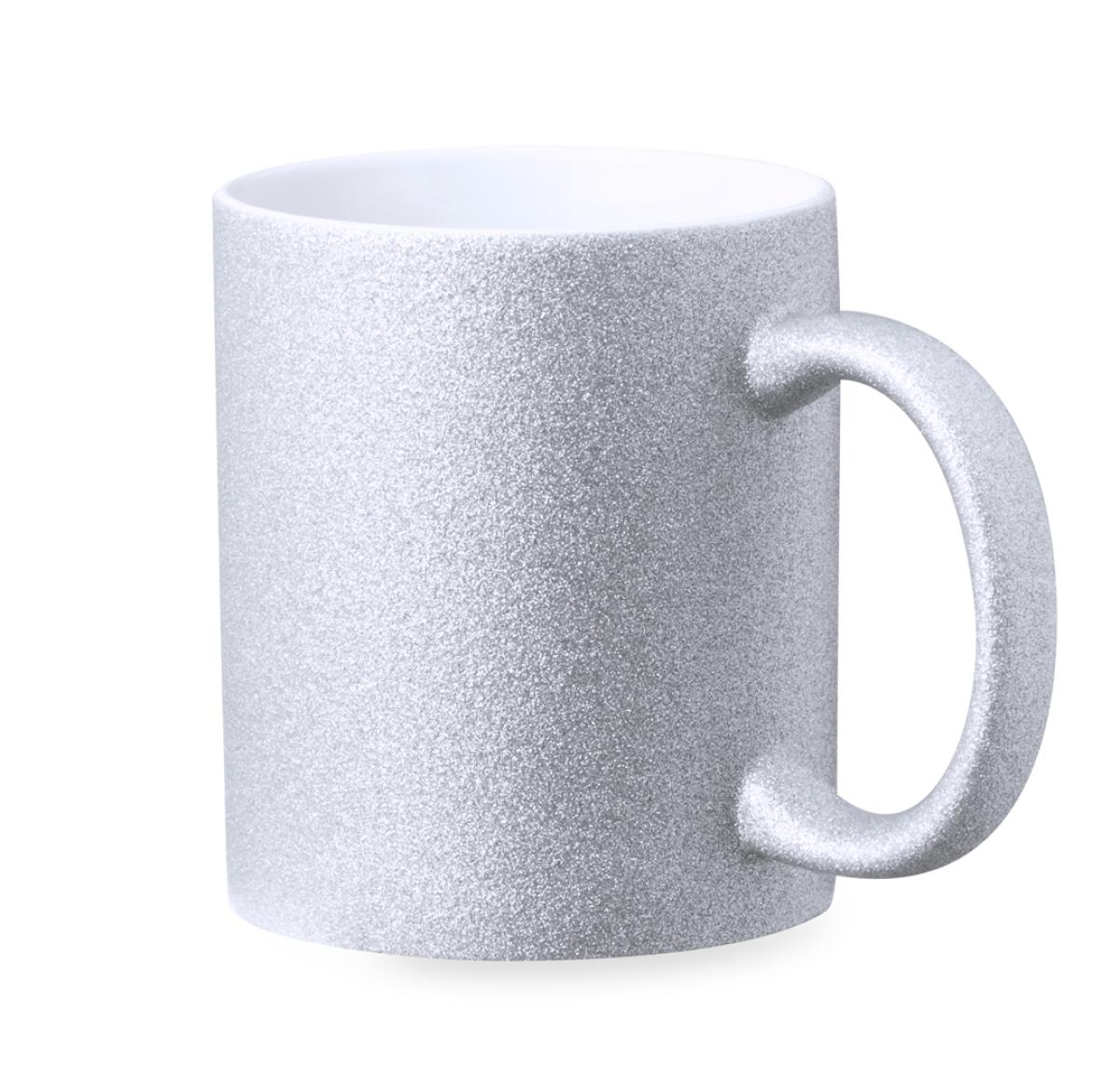 Ceramic mug with a capacity of 350 ml. Original glitter effect coating and specially designed for sublimation marking. Available in silver color and presented in an individual kraft box. 350 ml