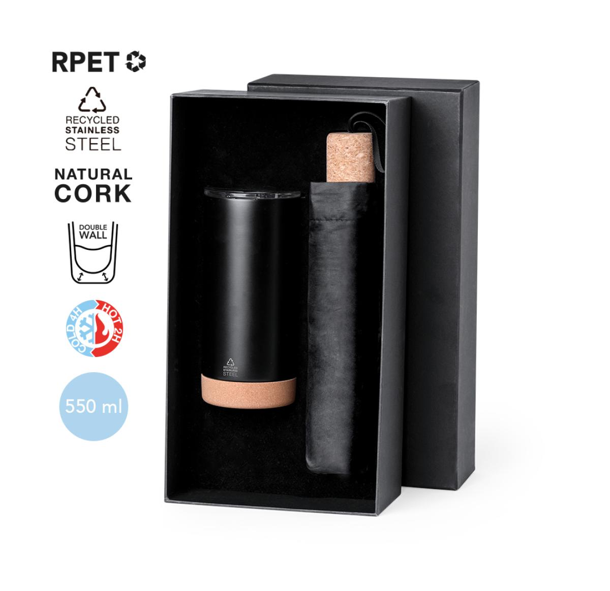 Stylish premium set. Including: Recycled Stainless Steel thermos tumbler with double wall and 550 ml capacity, in elegant matte black finish. Cork base, with push-on lid and dispenser. Foldable black umbrella with 98cm diameter. In 190T RPET pongee material and with cork handle. Manual opening, with windproof mechanism and fibre glass ribs. With distinctive RPET label. Set presented in an individual matte-finish case, with inner die-cutting for each of the elements of the set. The RPET material is made from recycled plastic, promoting the reuse of plastic waste and helping the sustainability of the planet. Insulated Bottle Recycled Stainless Steel/ Cork. 550 ml