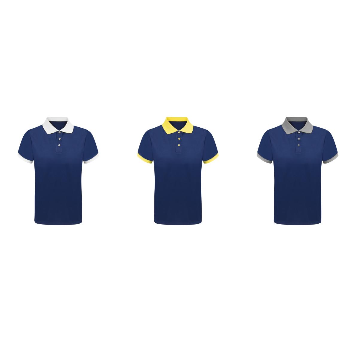 Technical polo shirt in 100% polyester piqu? material 180g/m2. Made in comfortable and soft breathable fabric, with side openings at the hems. Original design in navy blue, with collar and sleeve details in contrasting and matching colour. With 3 stylish button fastenings to match the collar and sleeve details. Available in various colours and in sizes XS, S, M, L, XL, XXL.
