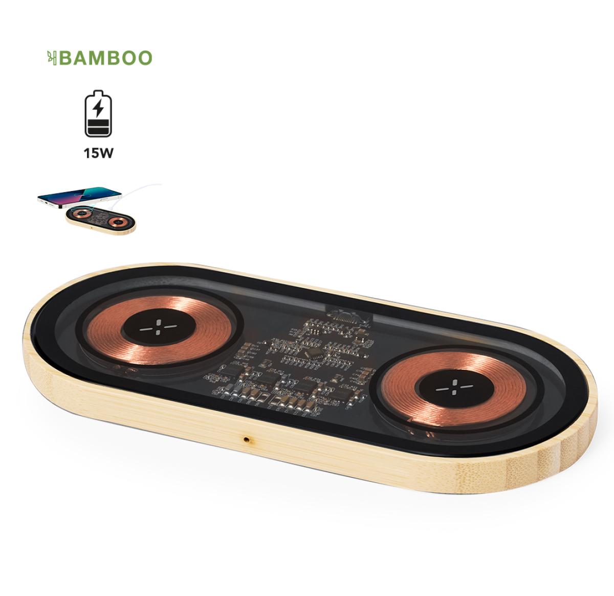 Dual 15W wireless charger in an original design with a transparent surface, showing the internal components of the device. With bamboo base, compatible with devices with Qi technology, and also enabling two devices to be charged at the same time. Type C connection, with instructions manual in English and Spanish. Presented in an individual box of kraft design. Materials such as bamboo encourage the use of natural raw materials, reducing pollutant emissions. It comes from a highly resistant and versatile plant with rapid growth and regeneration, making of it an excellent alternative to traditional wood. Manufactured according to RoHS standards and in compliance with the following safety requirements: Overheating protection system. Over-charge protection system. Blocking system to prevent short circuits. Wireless 15WRPET material is made from recycled plastic, thus promoting the reuse of plastic waste and helping the sustainability of the planet.
