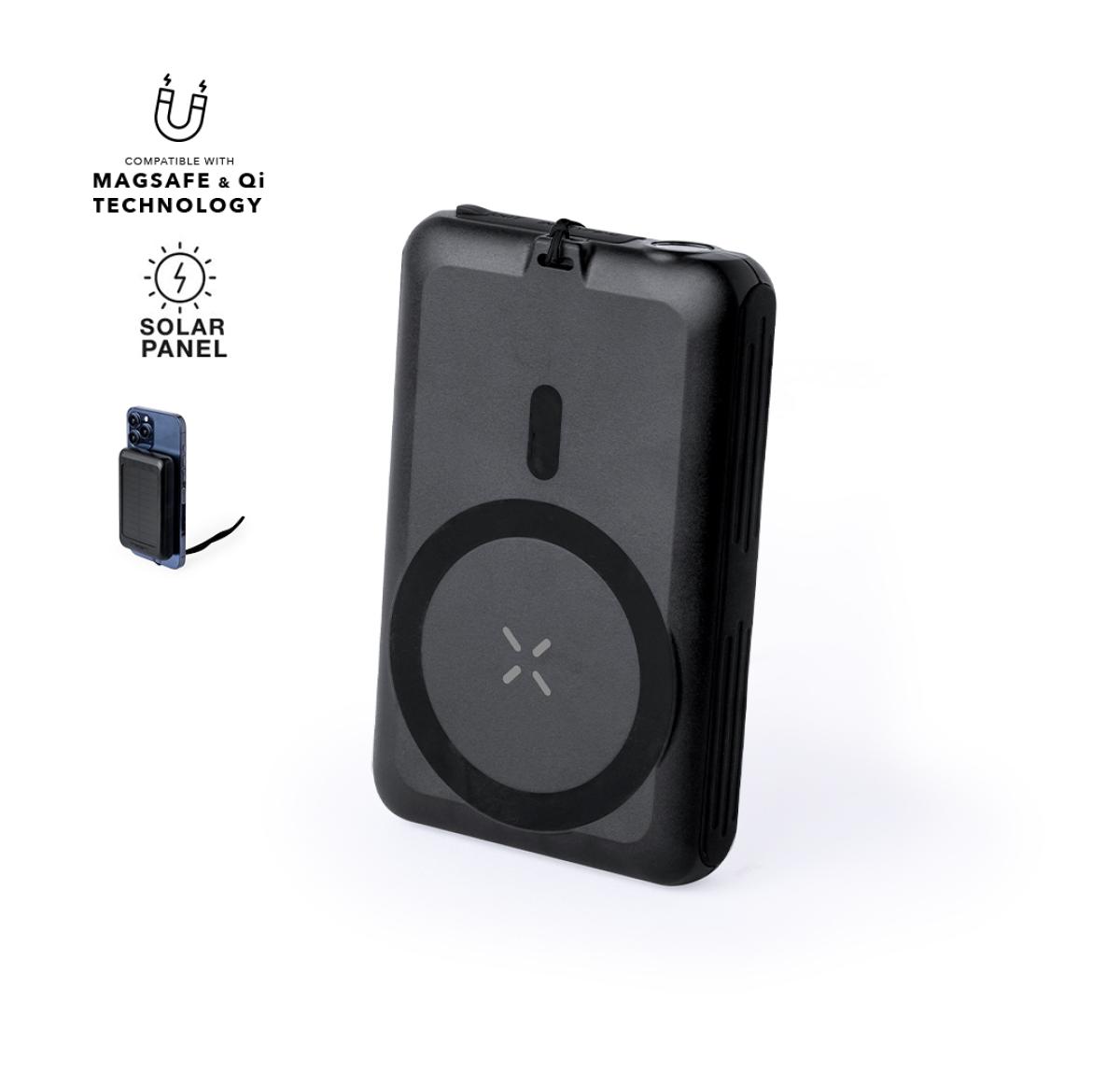 External auxiliary battery with solar charging and 5,000 mAh. With integrated 5W wireless charger and Magsafe magnetic attachment, allowing the device to be used while charging, and compatible with devices equipped with Qi wireless charging technology. It also features an LED light with two positions: steady and flashing. Presented in an individual box with an attractive design. The capacities shown in all our external auxiliary batteries are real, all of them incorporating non-recycled, grade A batteries, with a service life of at least 500 charging cycles, and complying with CE regulations. In addition, they are manufactured according RoHS standards, and in compliance with the following safety requirements: Power bank overcharge protection system. Complete discharge protection system, which increases the durability of the power bank. Blocking system to prevent short circuits. Constant charging transfer system, in accordance with the capacity of the target device.