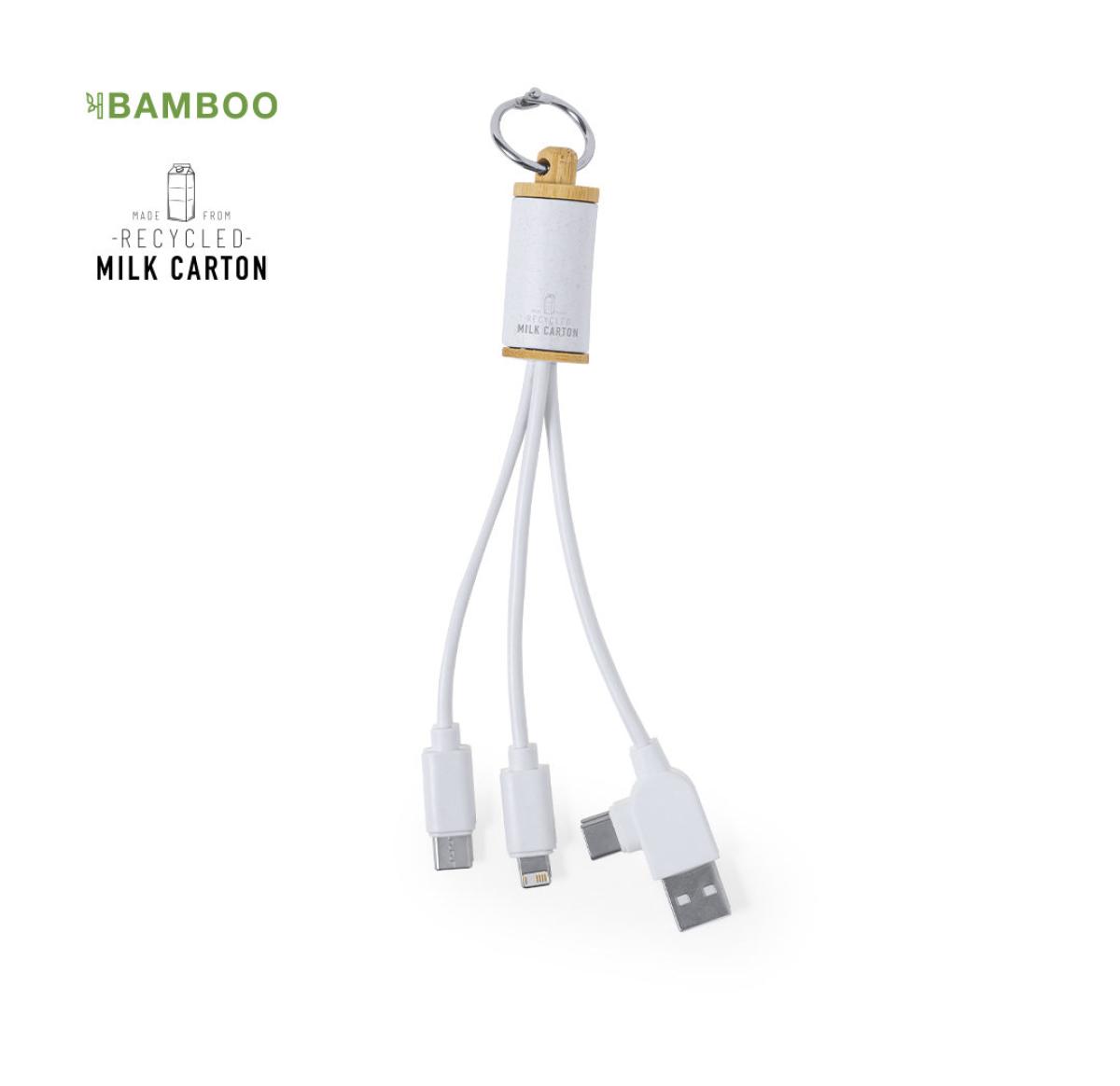 Charging cable made in combination of bamboo and recycled material from milk cartons. Includes dual USB/Type C connection + Micro USB, Type C and Lightning connections. With original transport ring and recycled milk cartons logo. Presented in an individual box in kraft design, with protective paper included. 5V DC 2.4A. Milk cartons are mostly made of cardboard and aluminum. During the recycling process, the different packaging materials are separated for reuse and re-purposing, thus contributing to the infinite path of the circular economy. This material is well known for its high recyclability, as well as for its lightweight and resistance. Materials such as bamboo encourage the use of natural raw materials, reducing pollutant emissions. It comes from a highly resistant and versatile plant with rapid growth and regeneration, making of it an excellent alternative to traditional wood. Manufactured according to RoHS standards, with blocking system to prevent short circuits. Micro USB, Type C and Lightning Connection 5V DC 2.4A