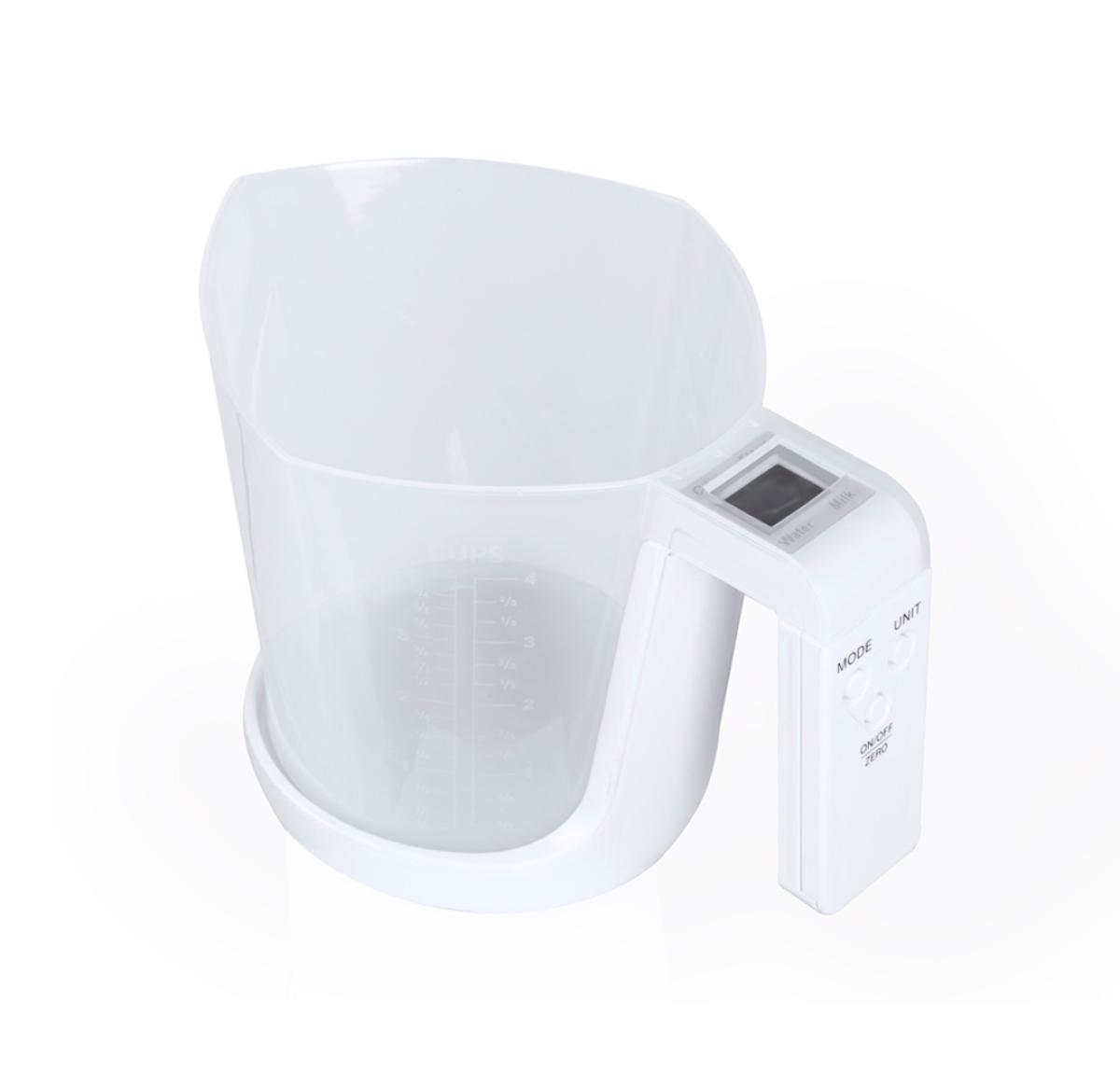 B?scula con jarra medidora integrada, fabricada en resistente combinaci?n de PP y ABS. Pantalla LCD con control por botones y funci?n de tara, con capacidad m?xima para 5 kg de peso y v?lida para medir elementos l?quidos o s?lidos. Incluye Jarra medidora de 1L de capacidad, con multitud de opciones y vertedero en el borde para evitar derrames:: -1L, con medidor lateral en tramos de 50 ml; -32 oz,, con medidor lateral en tramos de 2 oz -Medici?n r?pida en volumen de tazas, Funciona con pila de bot?n (incluida) y viene presentada individualmente en caja.