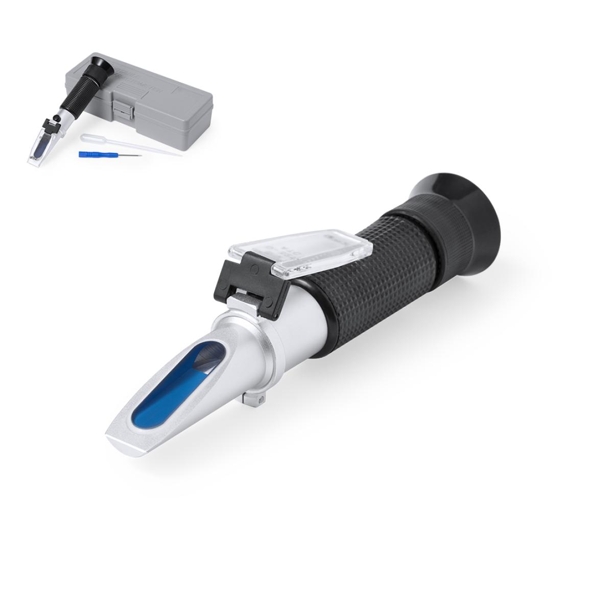 Portable hand-held refractometer, specially designed for Brix control. It is operated by pouring a drop into the designated compartment, then lowering the transparent lid and looking through the viewer, while adjusting the knob. Portable and supplied inside a hard case. With instructions manual in English and Spanish, and presented in a kraft design box. Contents: -Refractometer -Hard case with foam lining -Pipette -Screwdriver -Cleaning cloth