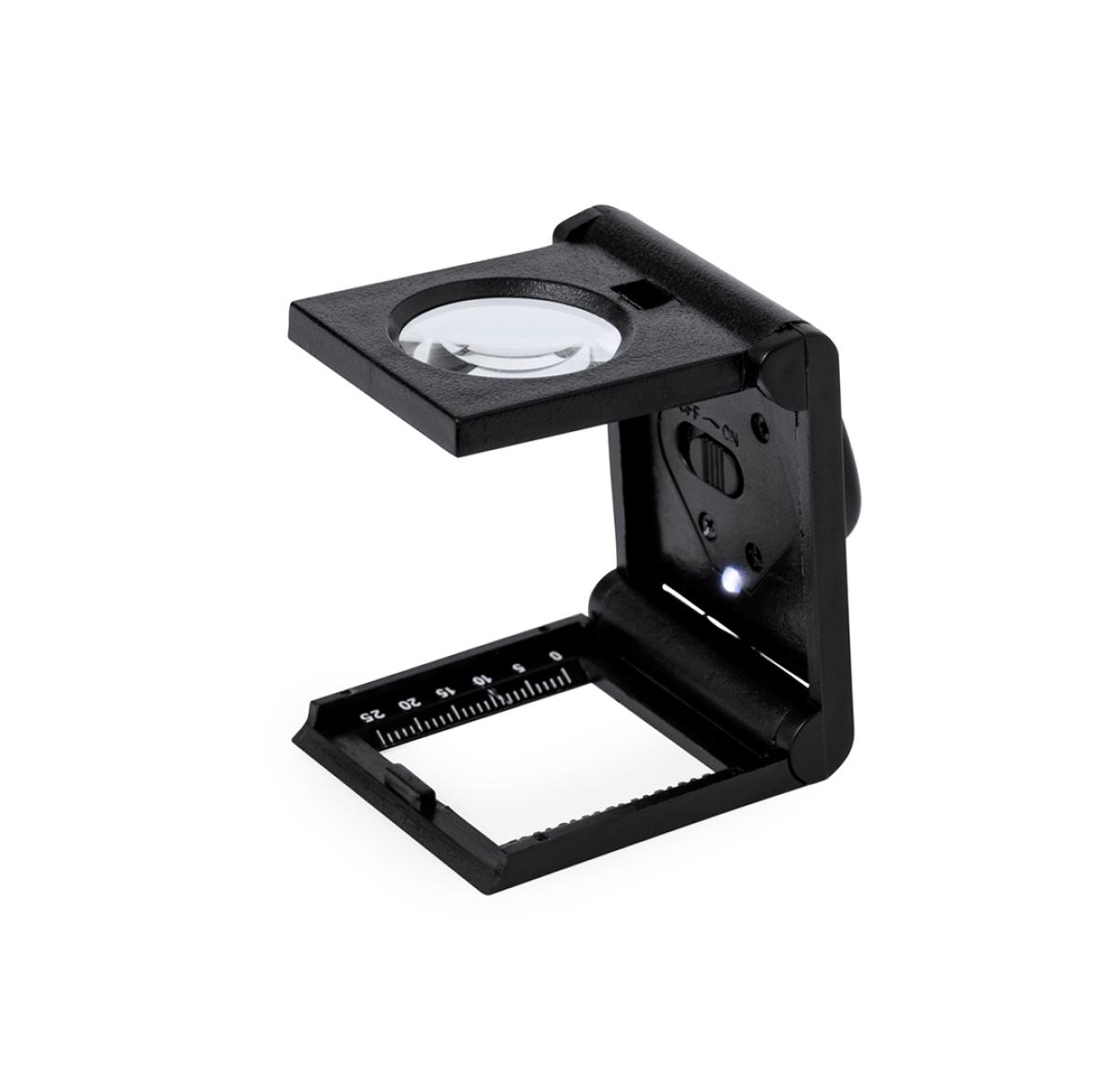 7x magnification folding magnifier made of sturdy PP, with integrated LED light and measuring ruler. Powered by button cell battery (included) and presented in an individual black cardboard box.