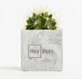 Modern and minimalist. This sustainable pot comes complete and planted with a small random cactus ready to look good in any office or home. Concrete pot with detailed laser engraving to one face. Recyclable. Reuseable.