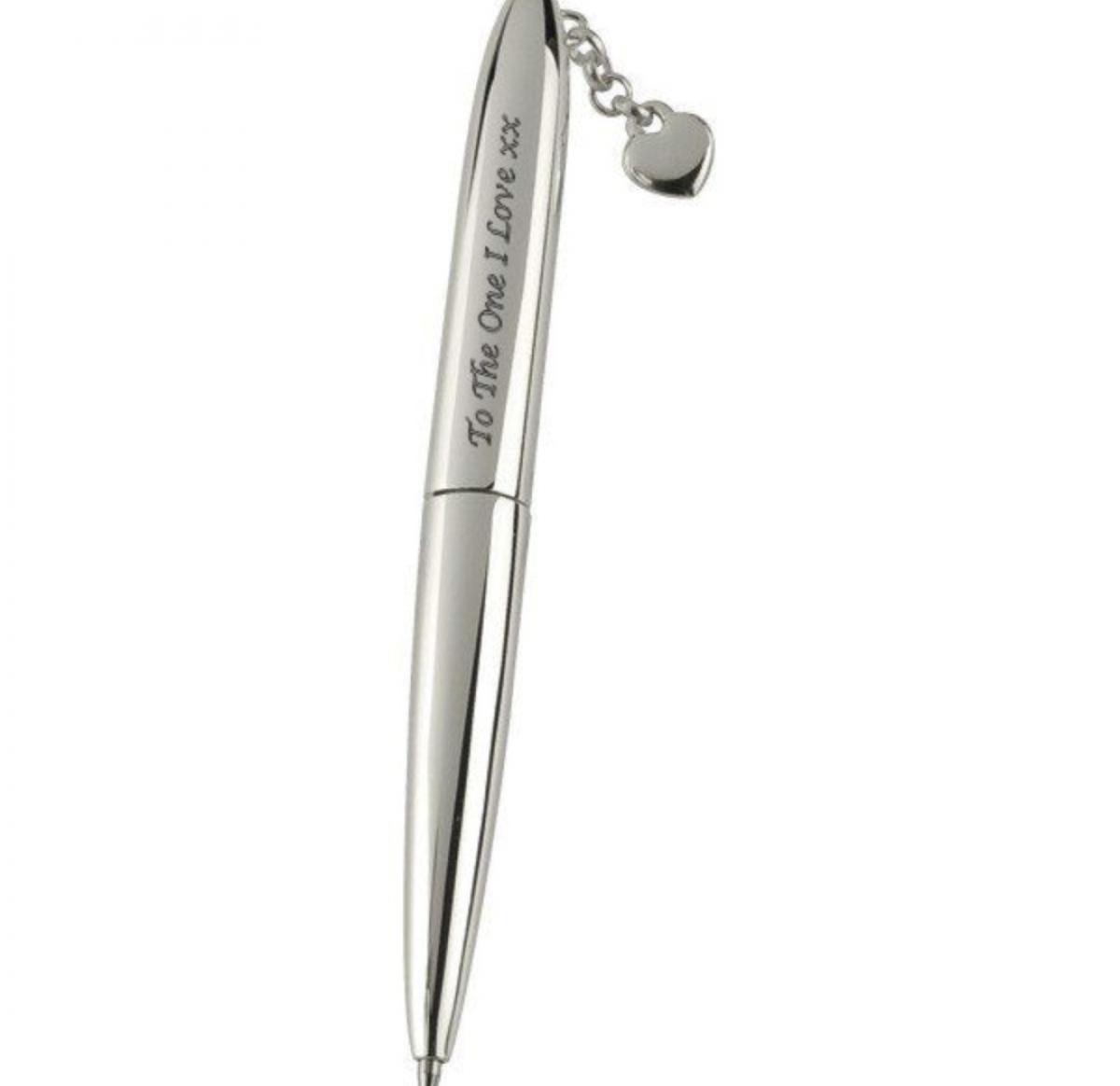 A ballpoint pen with a heart trinket on the top. Comes with a smooth black pen case, silver plated