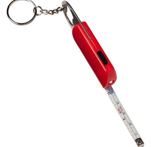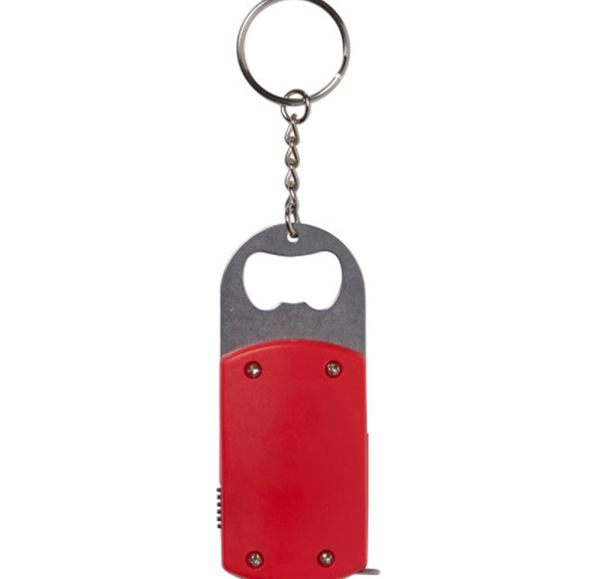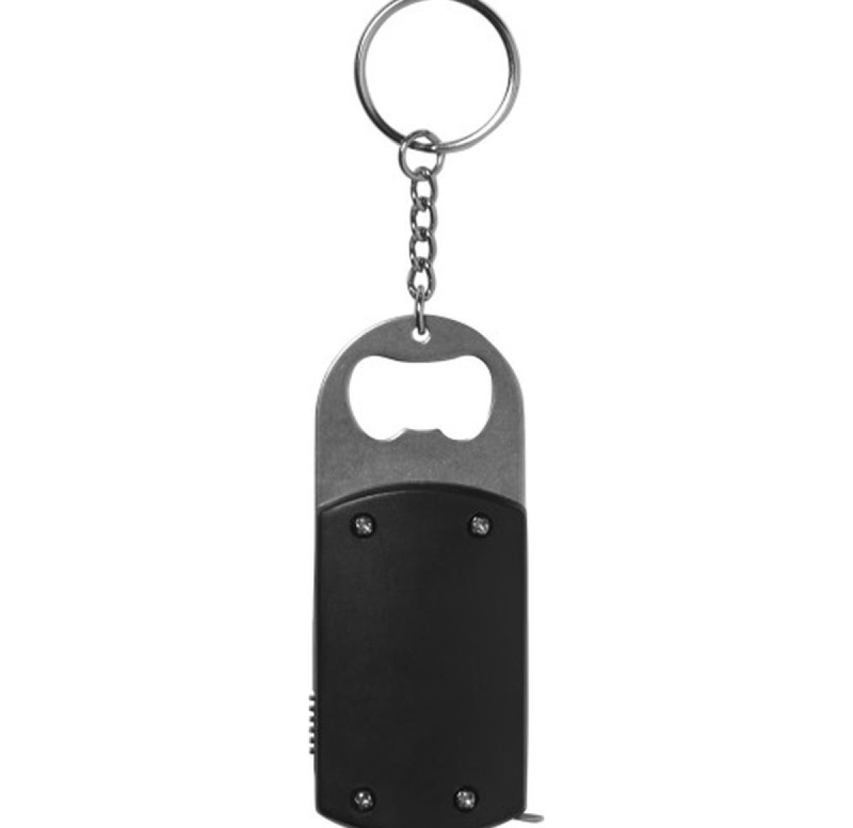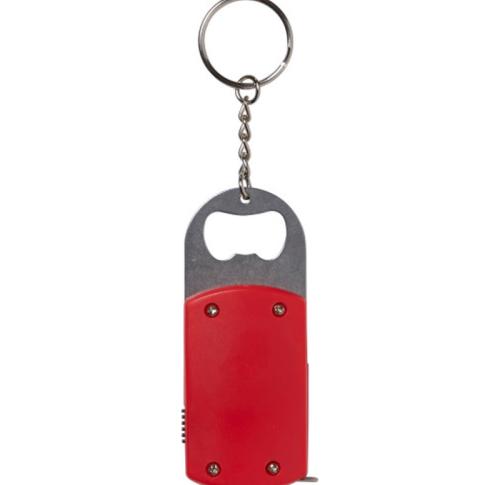 Bottle opener with steel keyring, one white LED and a one meter tape measure. Batteries included.