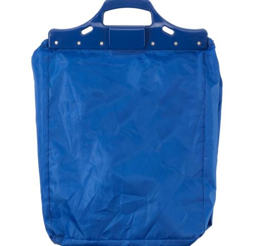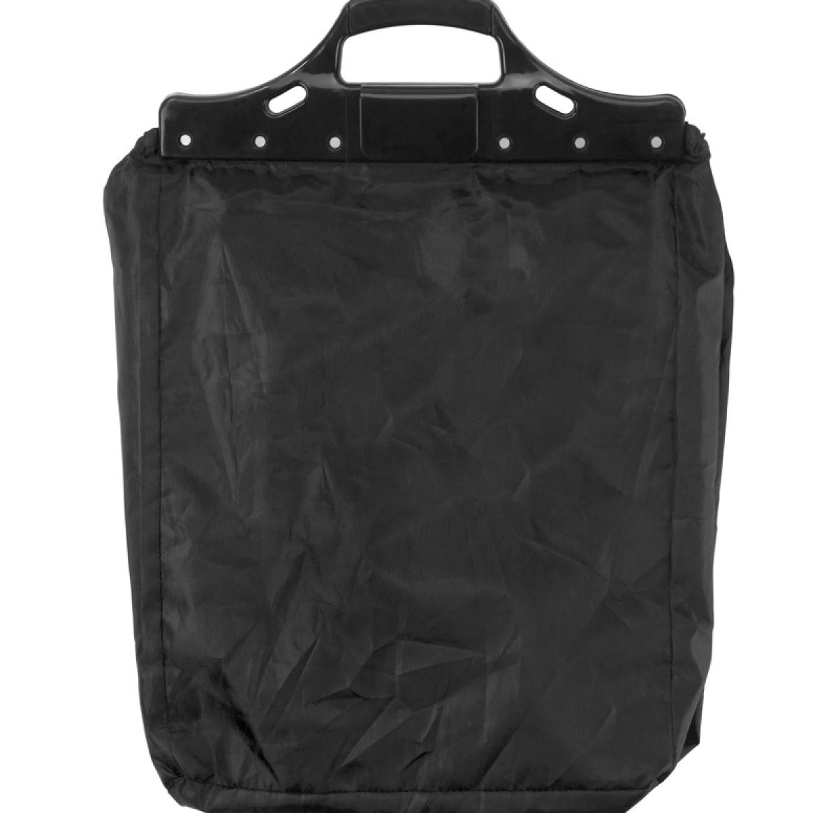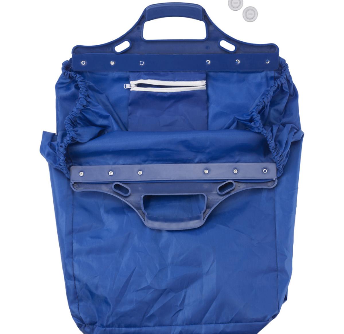 Polyester (210D) trolley shopping bag with two plastic handles and two plastic coins which are supplied in the internal pocket.