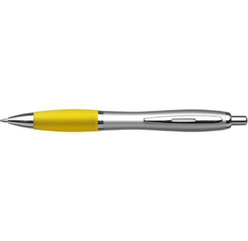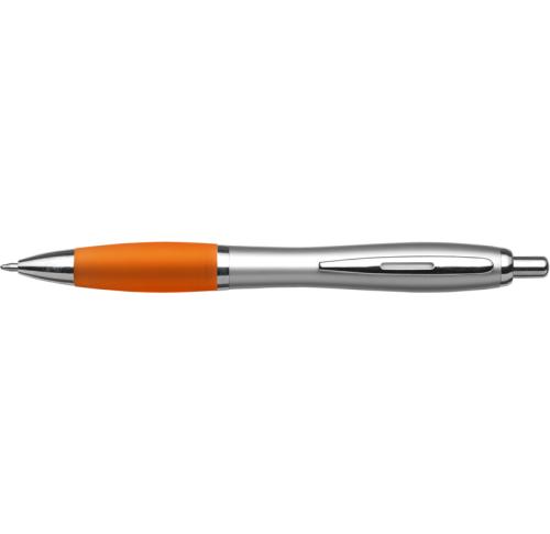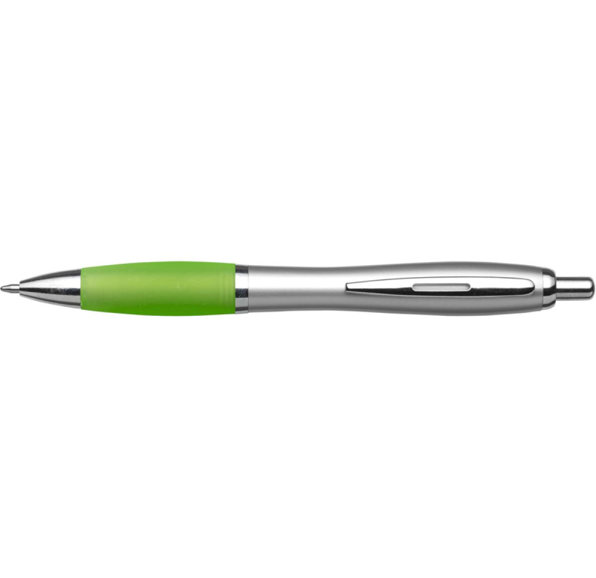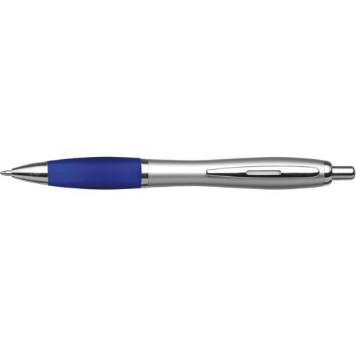 Eco-friendly recycled ballpen with blue ink, rubber grip and silver barrel. Comfortable and sustainable.