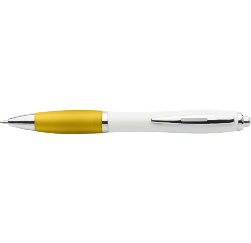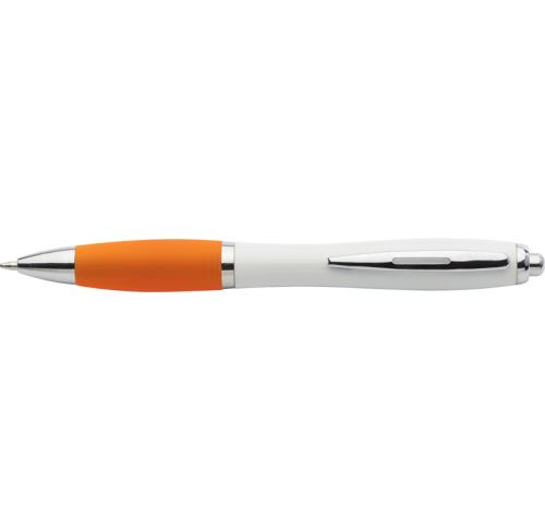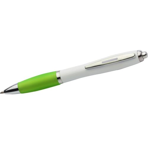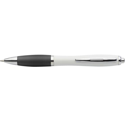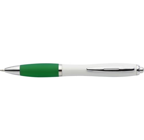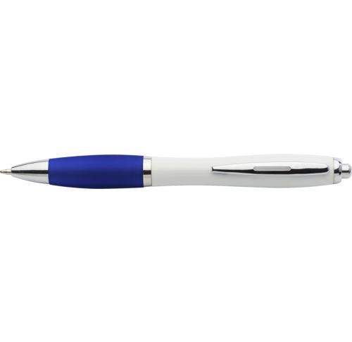 Eco-friendly recycled ballpen with blue ink, rubber grip and white barrel. Comfortable and sustainable.