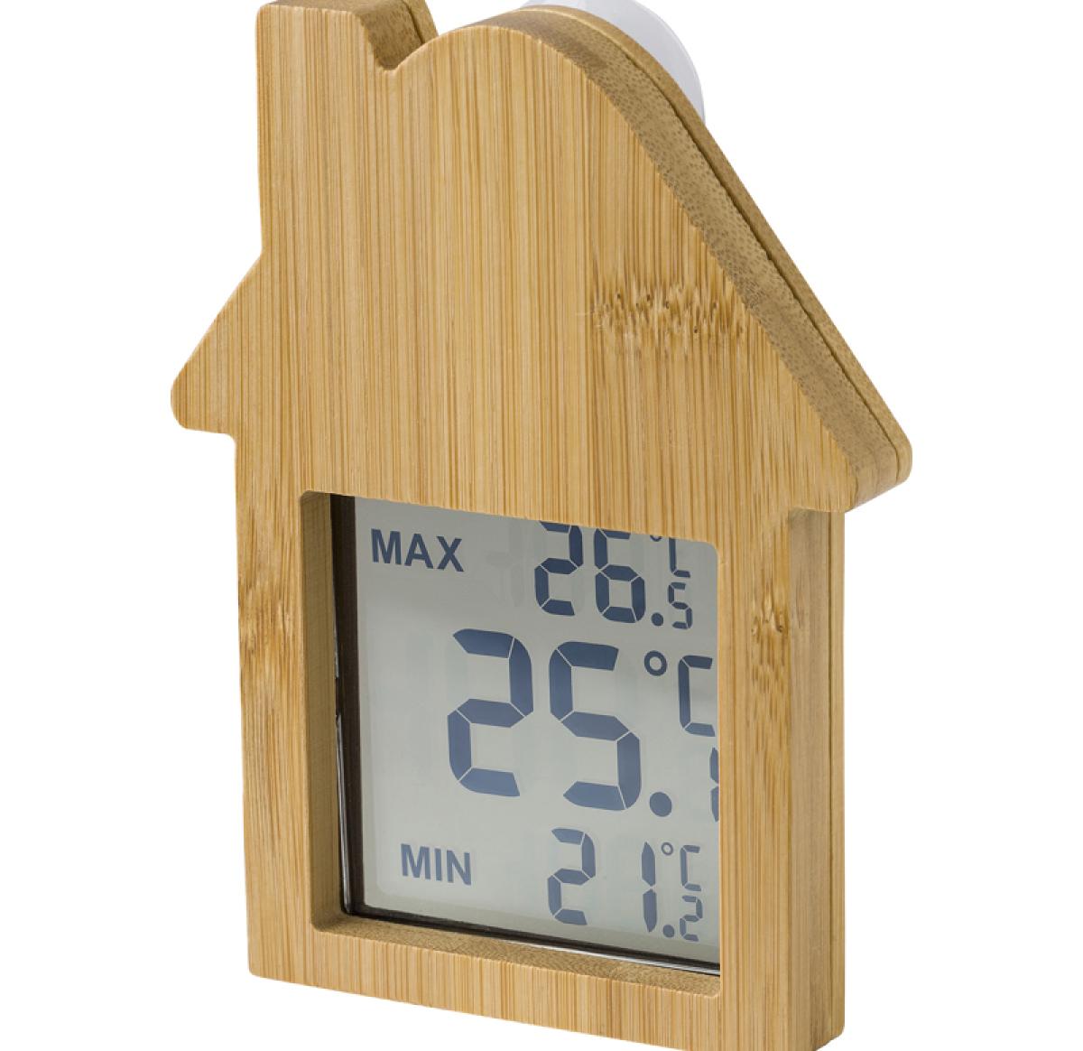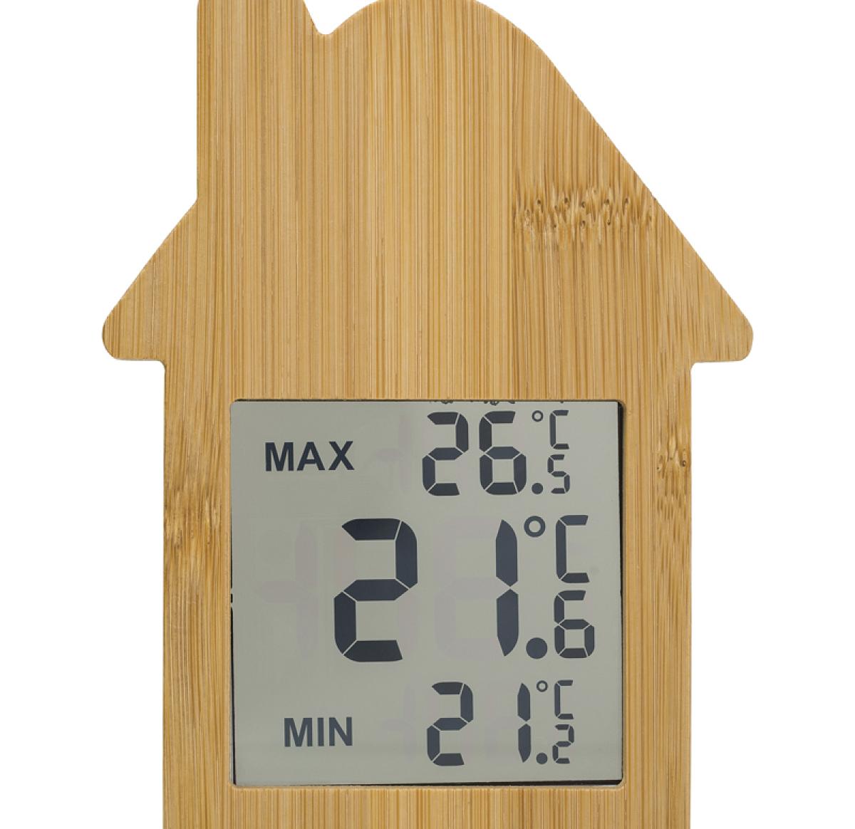 House shaped bamboo weather station, offering current, minimum, and maximum temperatures. It comes with a suction cup for easy mounting and includes batteries. Individually packaged in a brown cardboard box, it's a perfect gift. Stay informed and stylish with this eco-friendly product