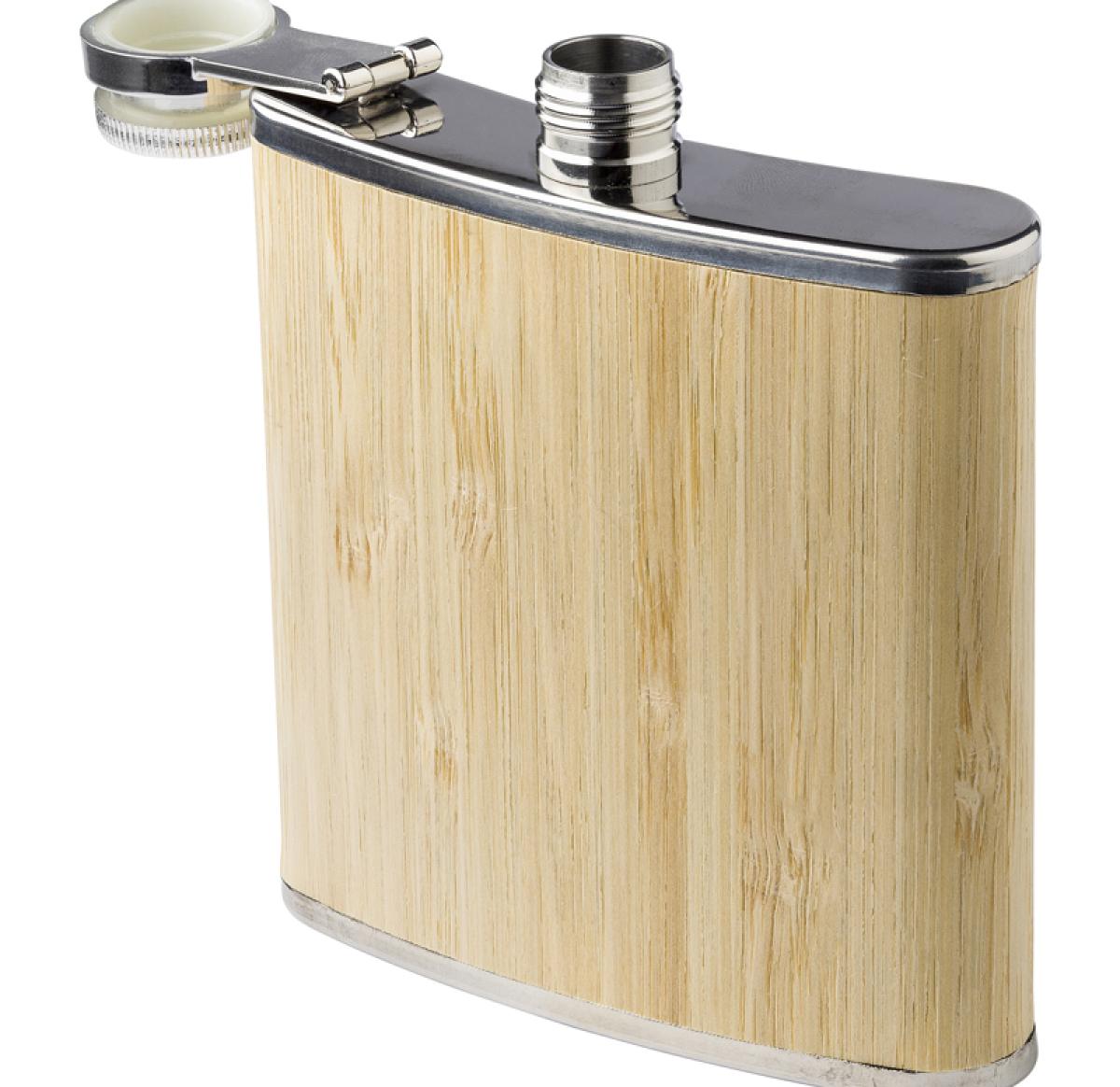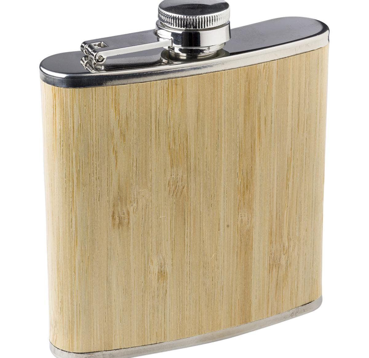 Stainless steel and bamboo hip flask, a stylish and eco-friendly choice. The flask features a layer of bamboo on the outside and has a 175 ml capacity. Stay classy and environmentally conscious with this elegant hip flask.