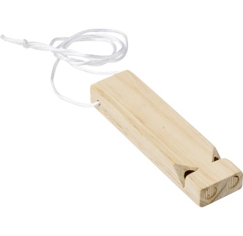 Pinewood whistle with RPET polyester cord, producing a train-like sound. Enjoy this eco-friendly and charming accessory for fun on-the-go.