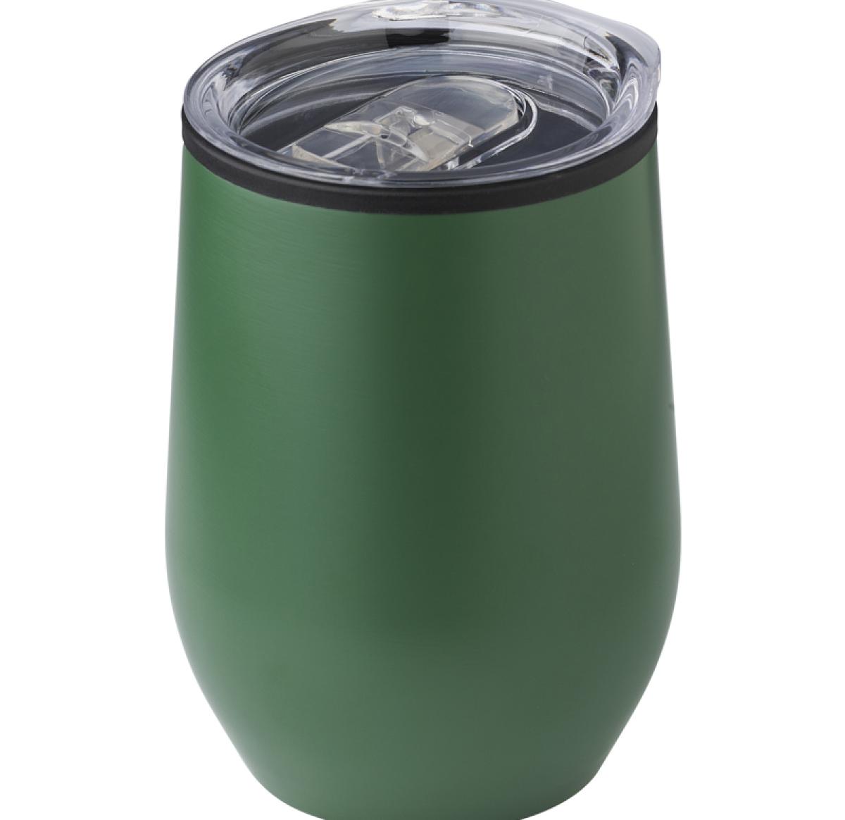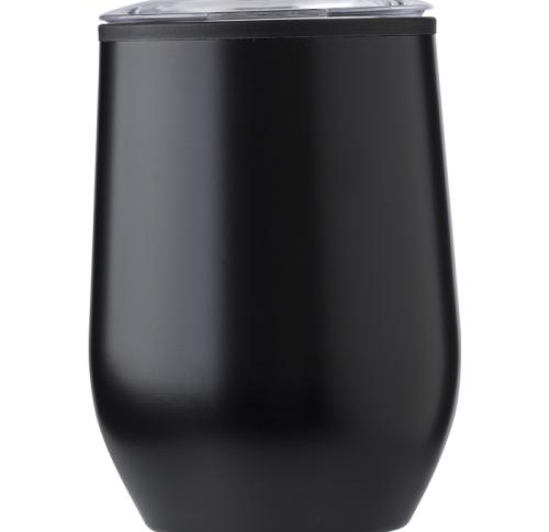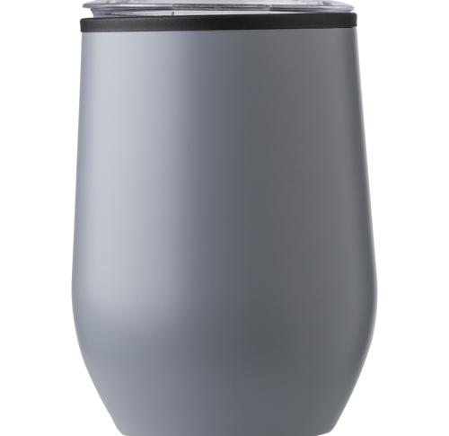 The stainless steel travel mug (300ml) has a matte finish, a polypropylene interior and a polystyrene lid. It comes individually packaged in a brown cardboard box. Practical and stylish for on-the-go hydration.