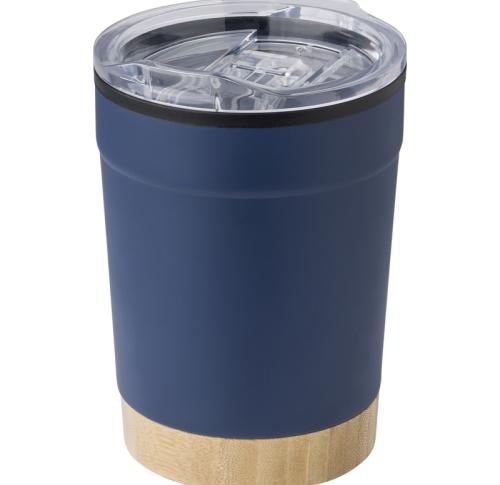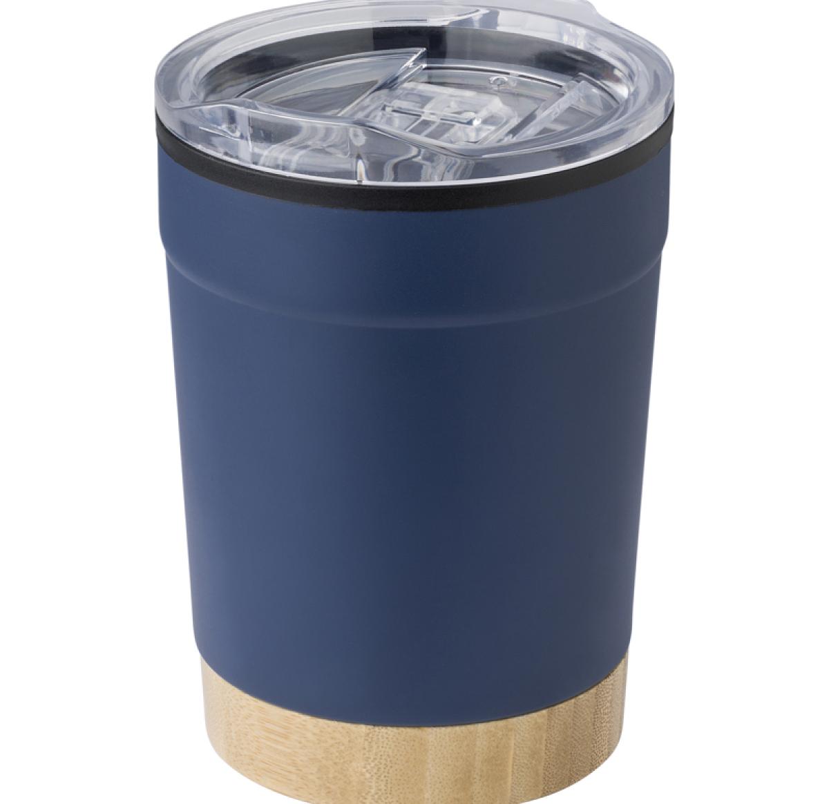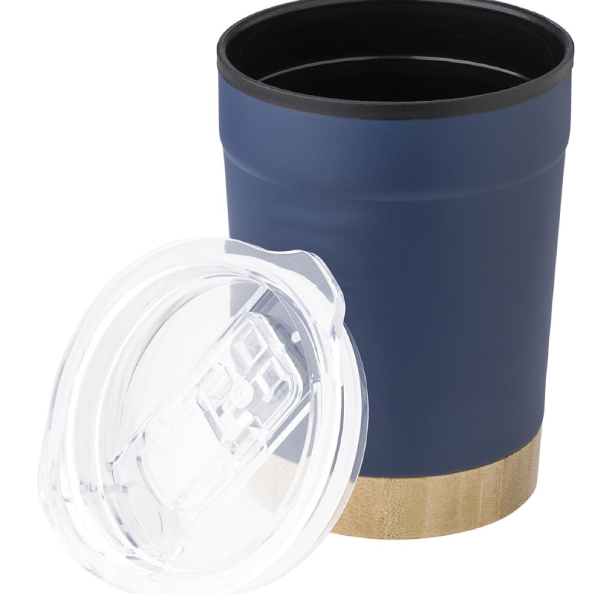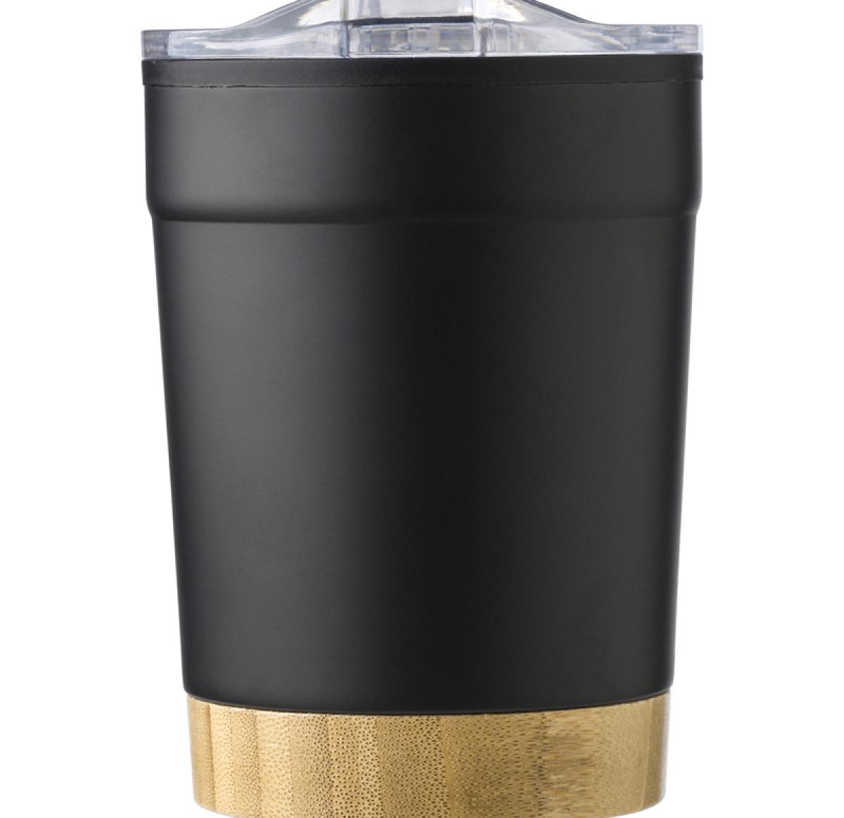 The stainless steel travel mug (300ml) has a polypropylene interior and a polystyrene lid with a bamboo base that can be hand washed. It comes individually packaged in a brown cardboard box. Stylish, practical, and eco-friendly for enjoying beverages on the go. Single Walled.Â
