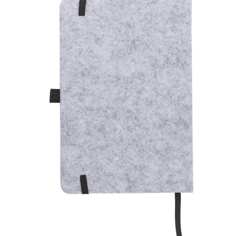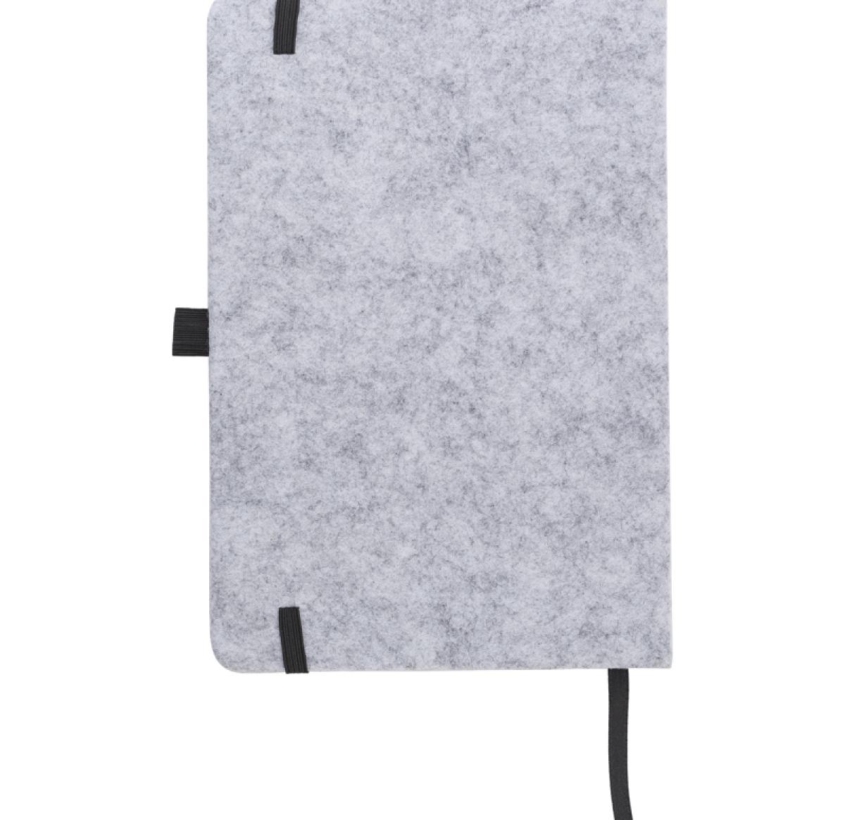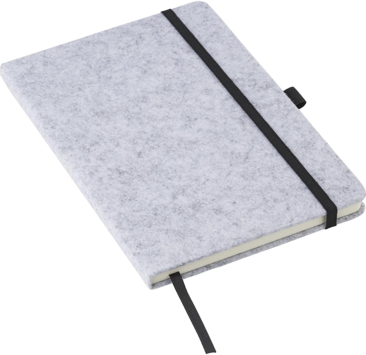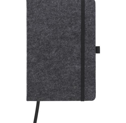 RPET felt notebook (A5) is a sophisticated and eco-friendly writing companion. It features a cover made from RPET felt, a material derived from recycled plastic bottles, making it a sustainable choice for environmentally conscious individuals. Inside, the notebook offers 160 lined pages and ribbon marker, providing ample space for jotting down your thoughts, notes, or creative ideas. To keep the contents secure and prevent any pages from getting damaged, the notebook is equipped with an elastic band over the cover.