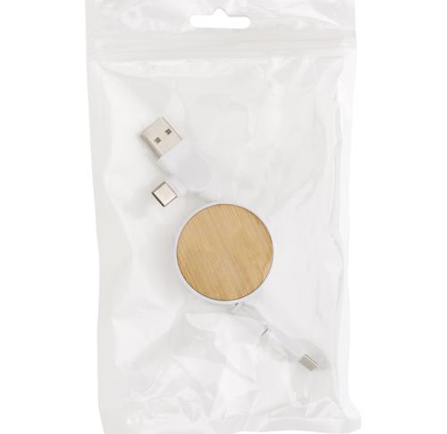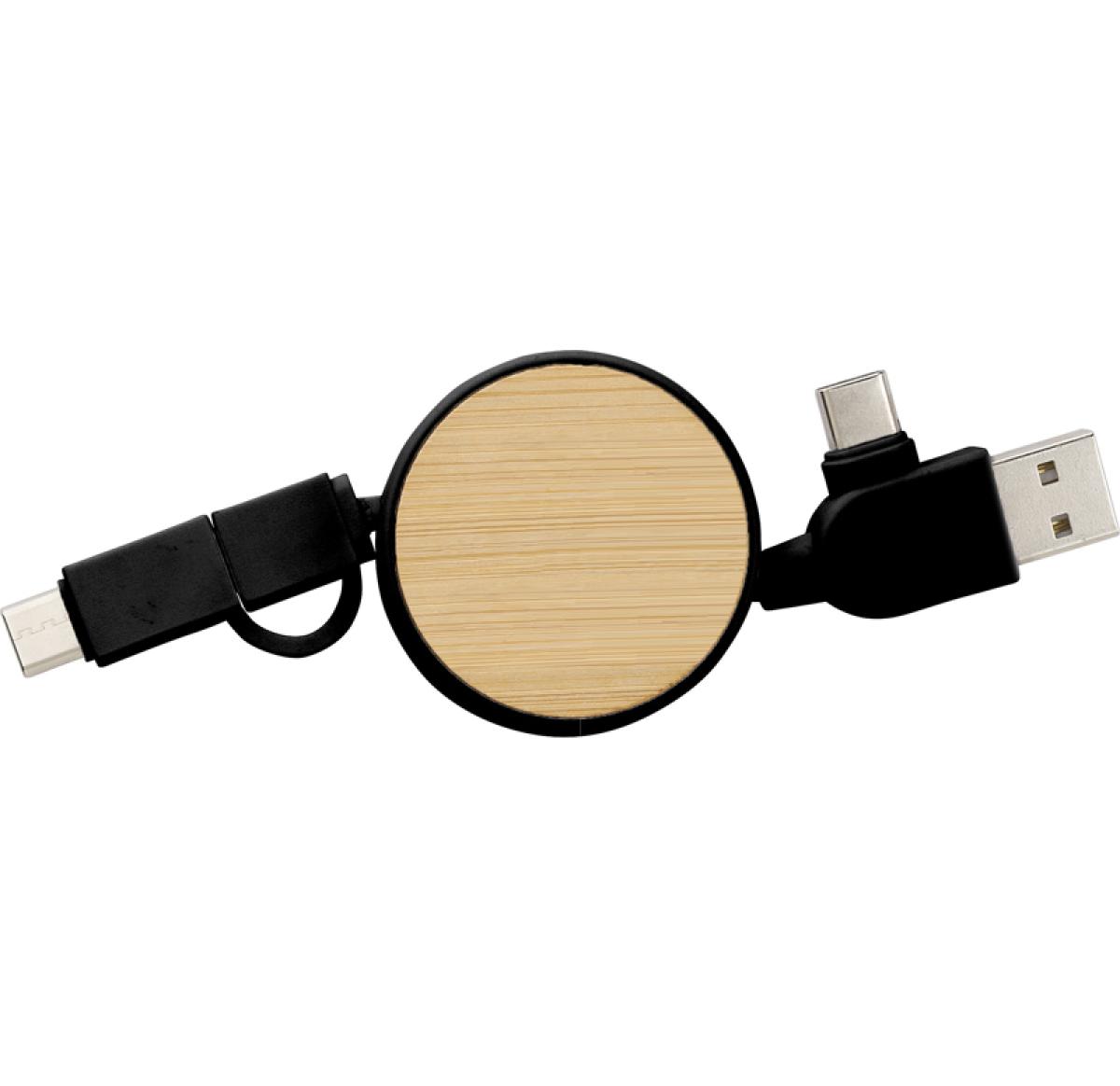 Extendable charging cable with bamboo details. Features USB-C, lightning, and USB-A connectors. Individually packaged in a brown cardboard pouch. Versatile, eco-friendly, and reliable for charging various devices.