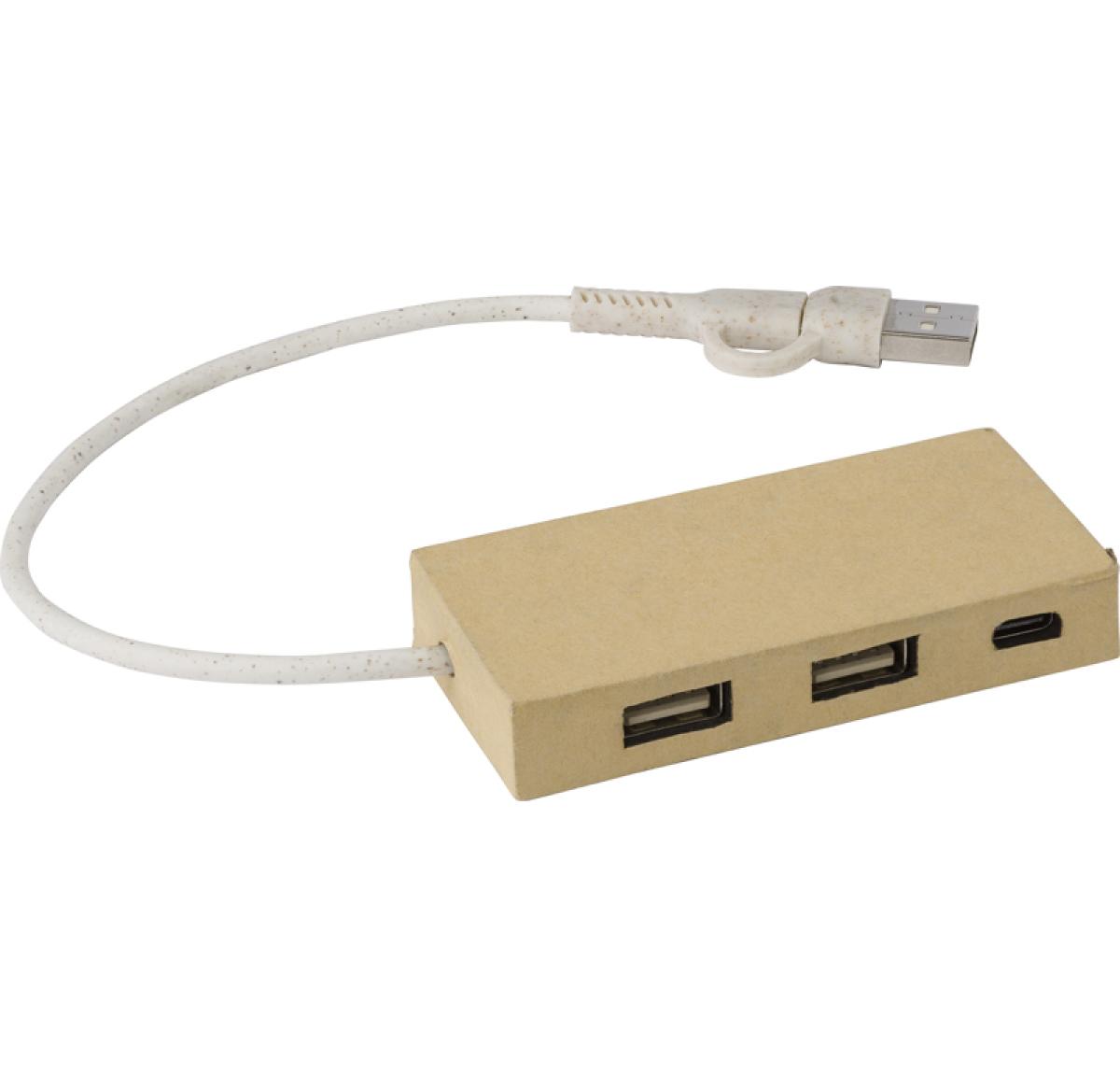 Aluminium and recycled paper USB (2.0) hub. Features two USB-C ports and two USB ports with USB-C input. Individually packaged in a brown cardboard box. Eco-friendly and practical for expanding connectivity.