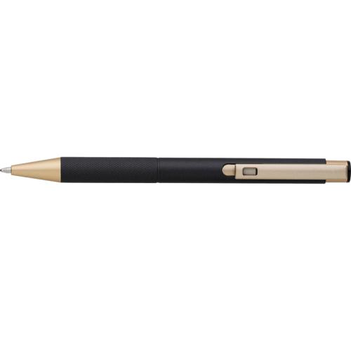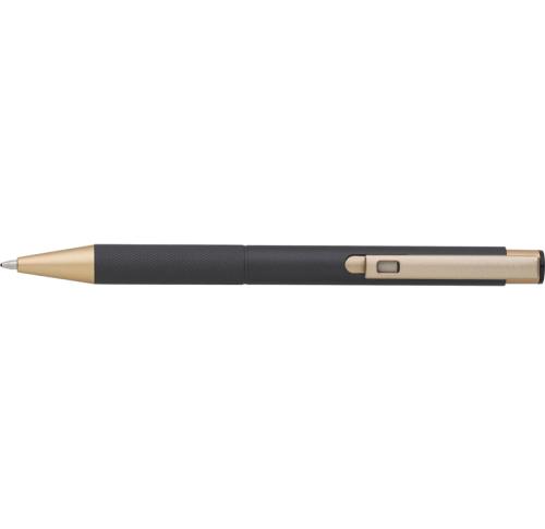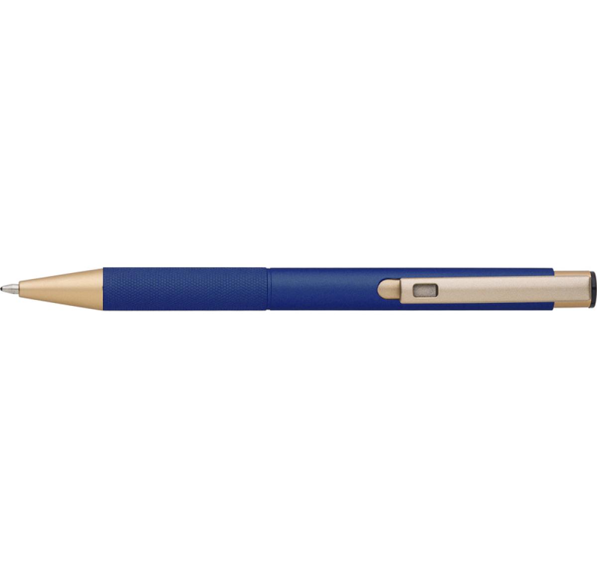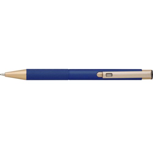 Aluminium, matt finished ballpen with a patterned grip, gold trim and blue ink.