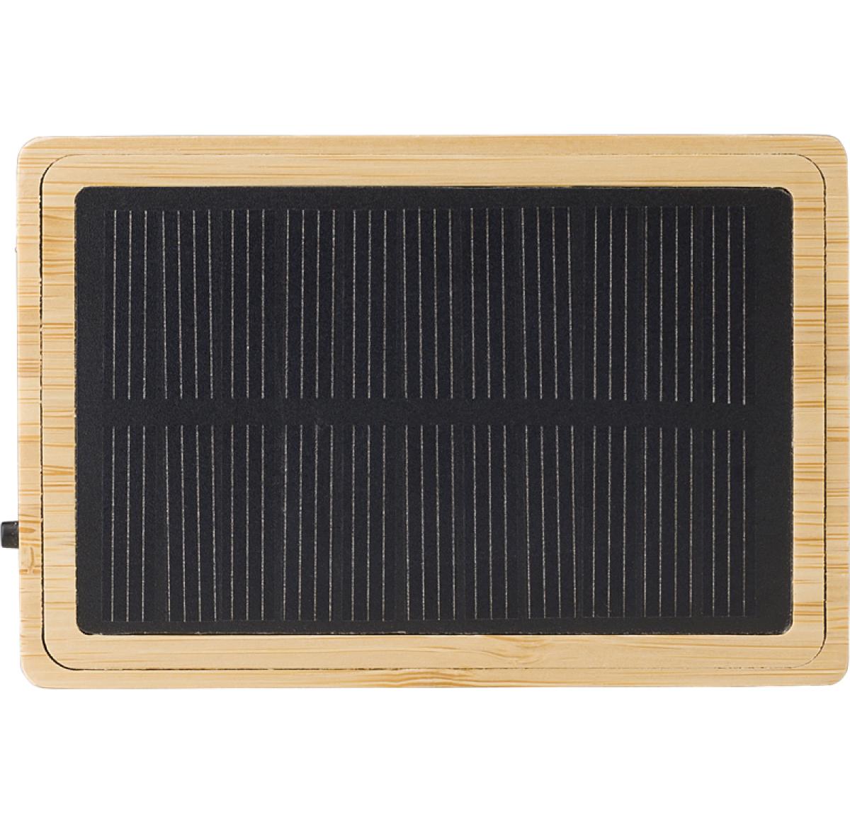 Bamboo wireless speaker with solar charging. Includes a 3W USB-C charging cable. Battery life up to 4 hours (500mAh).