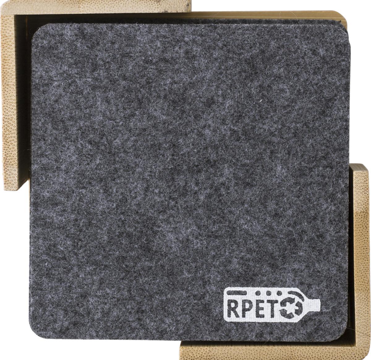 Felt coasters in a bamboo case. Each of the 10 coasters has a RPET logo. Individually packaged in a brown cardboard box.