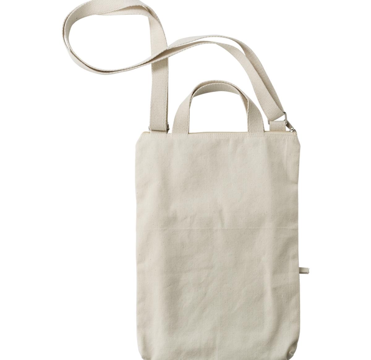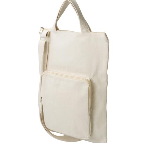 Cotton bag, suitable for a 15 inch laptop. Features a large zipped compartment, a small zipped pocket, two short handles and one adjustable shoulder strap. 340g/12 oz