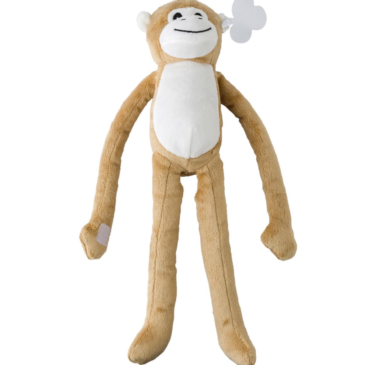 Plush monkey with long arms that have a Velcro closing, embroidered eyes and an ear tag for printing.