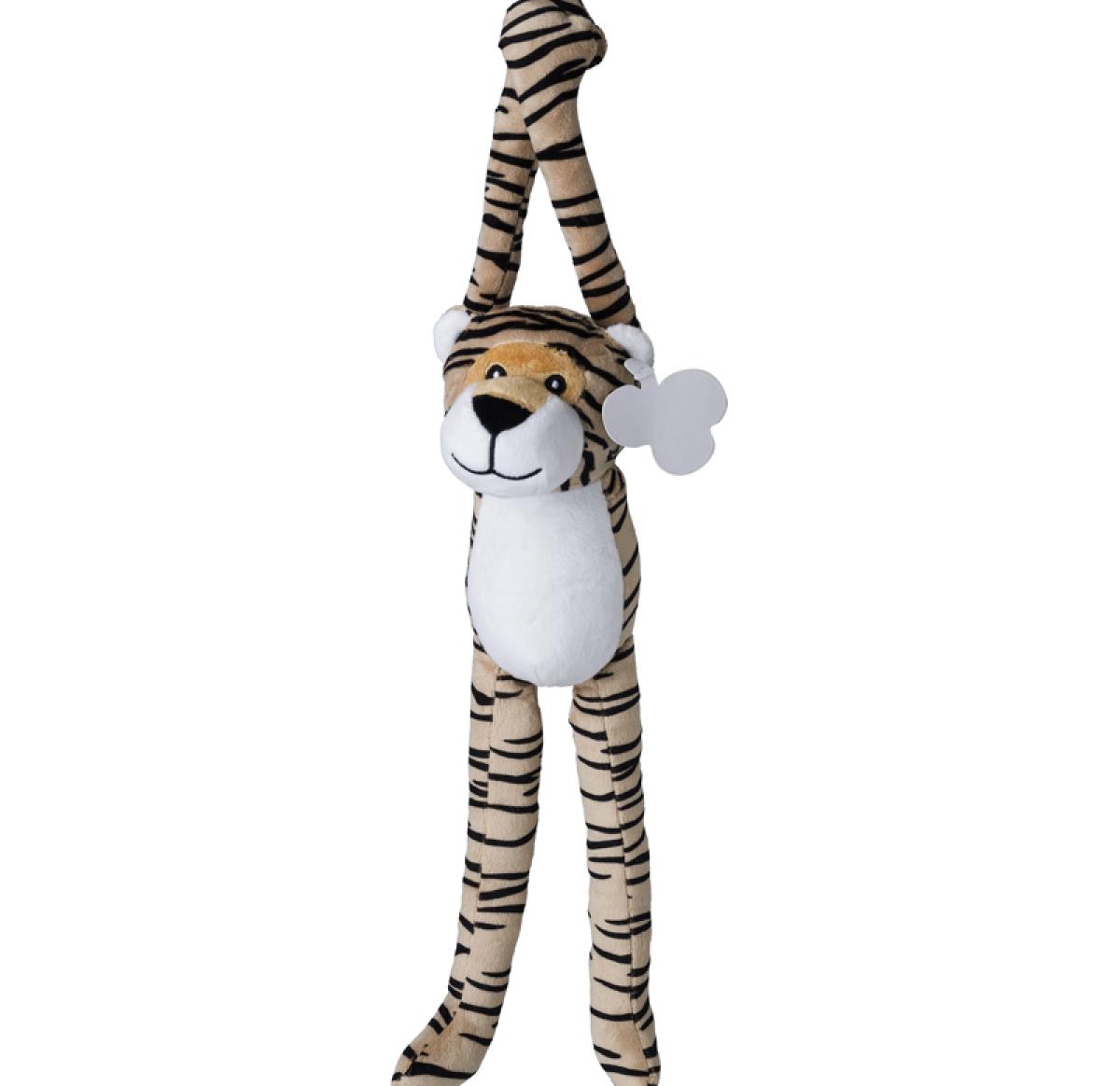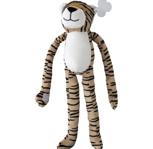 Plush tiger with long arms that have a Velcro closing, embroidered eyes and an ear tag for printing.
