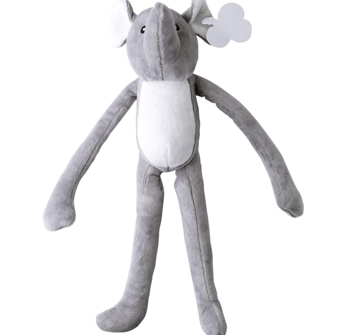 Plush elephant with long arms that have a Velcro closing, embroidered eyes and an ear tag for printing.