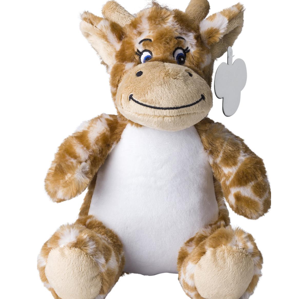 Plush giraffe with embroidered eyes. Combines with T-shirt item 5013. Also includes a tag for printing purposes.