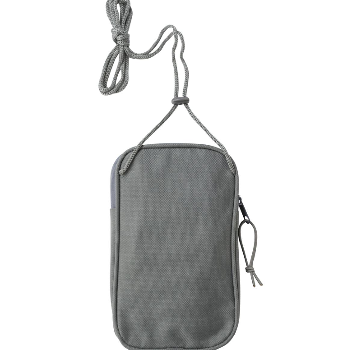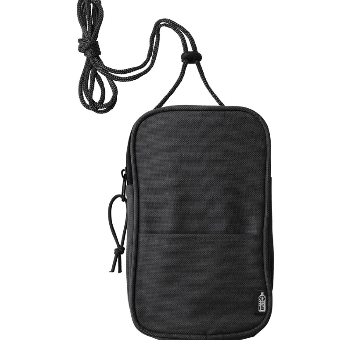 Small RPET polyester (600D) cross shoulder bag with adjustable wrist cord.